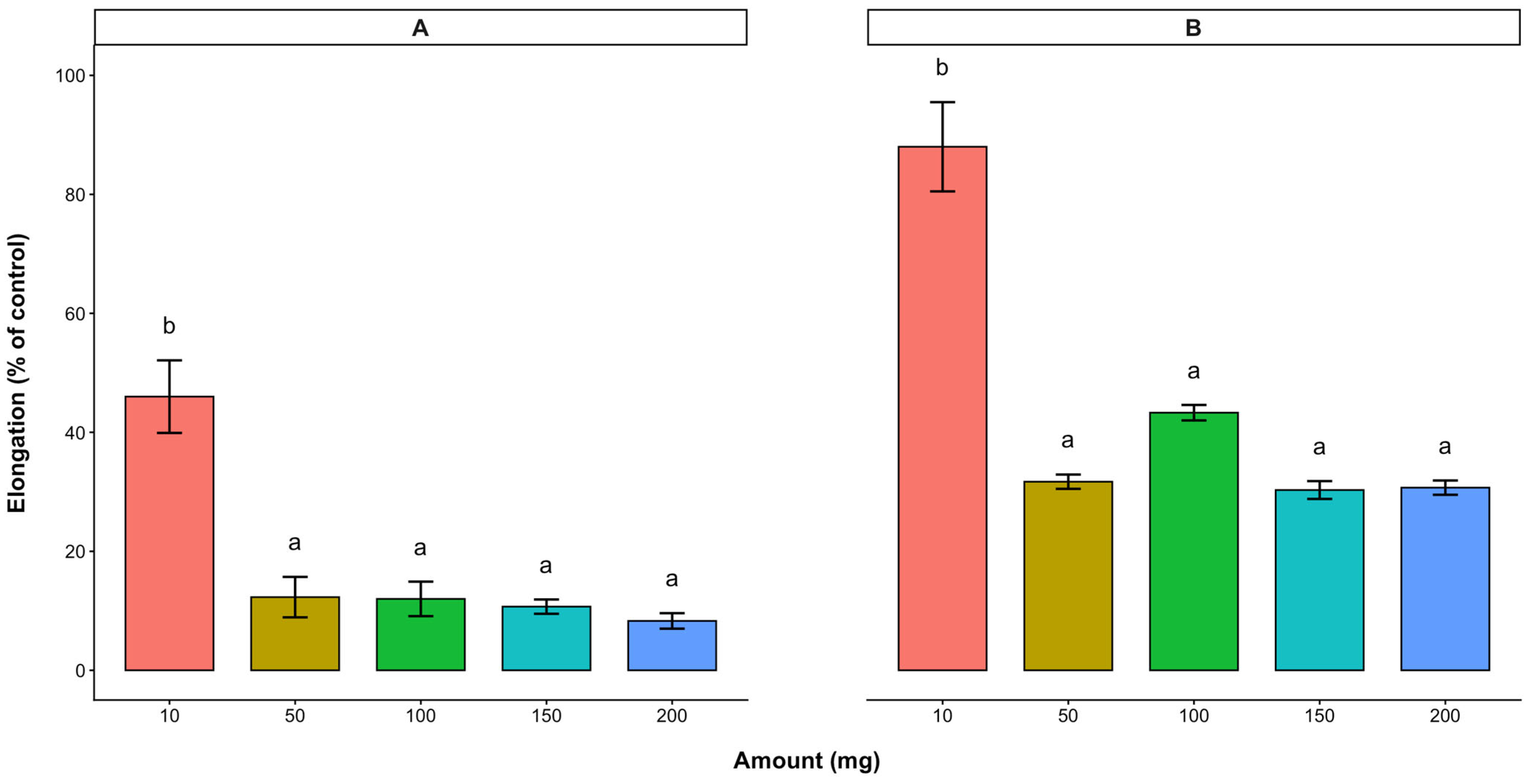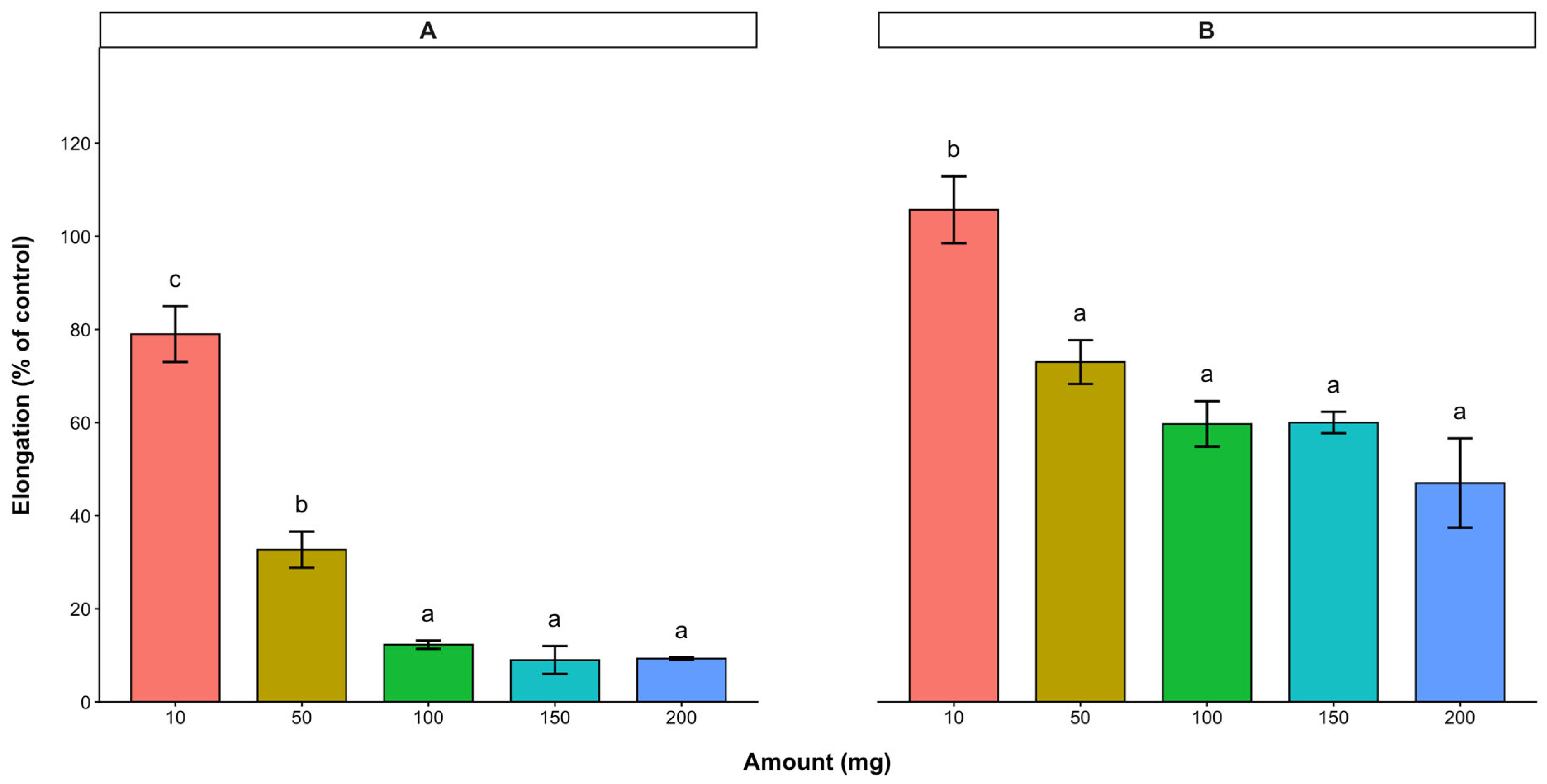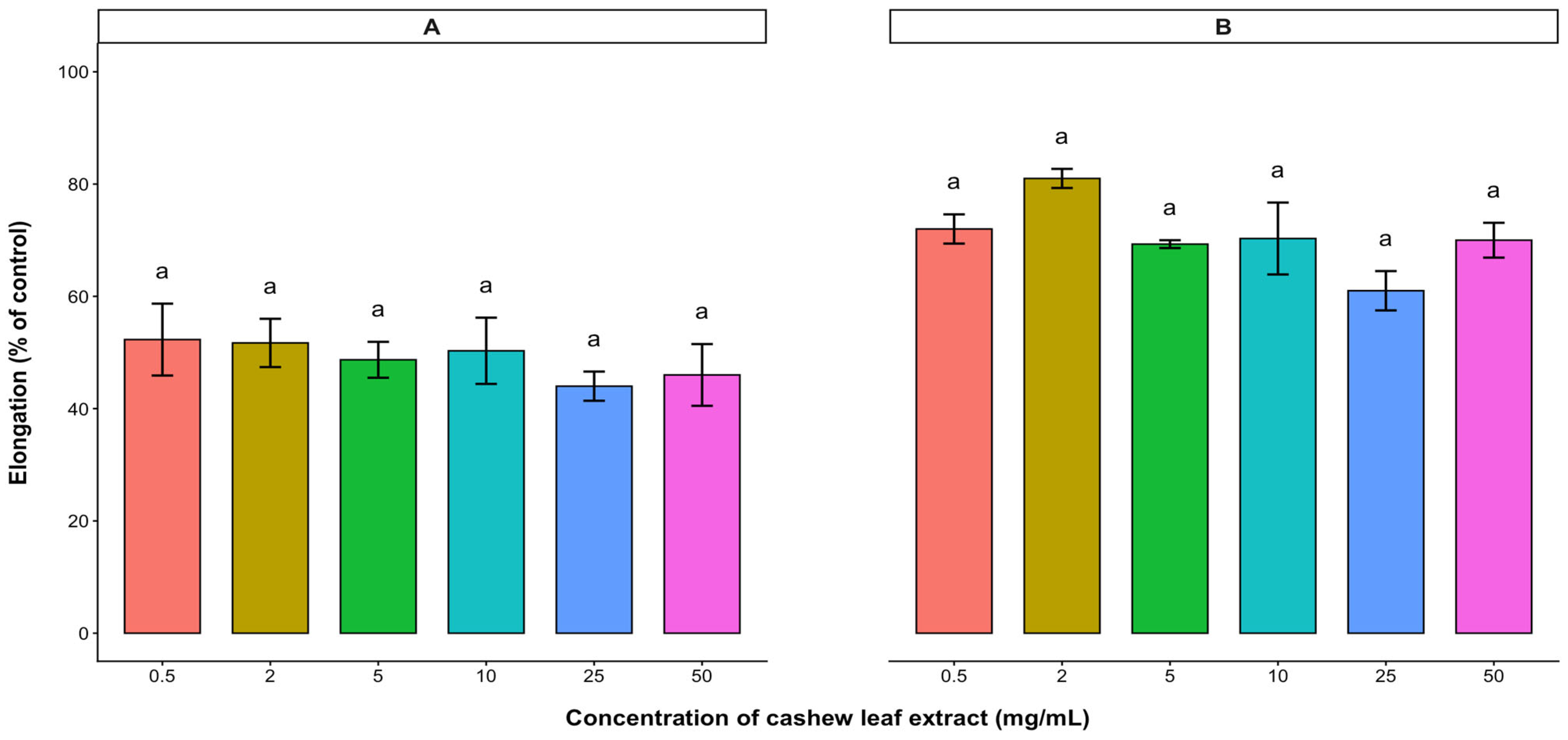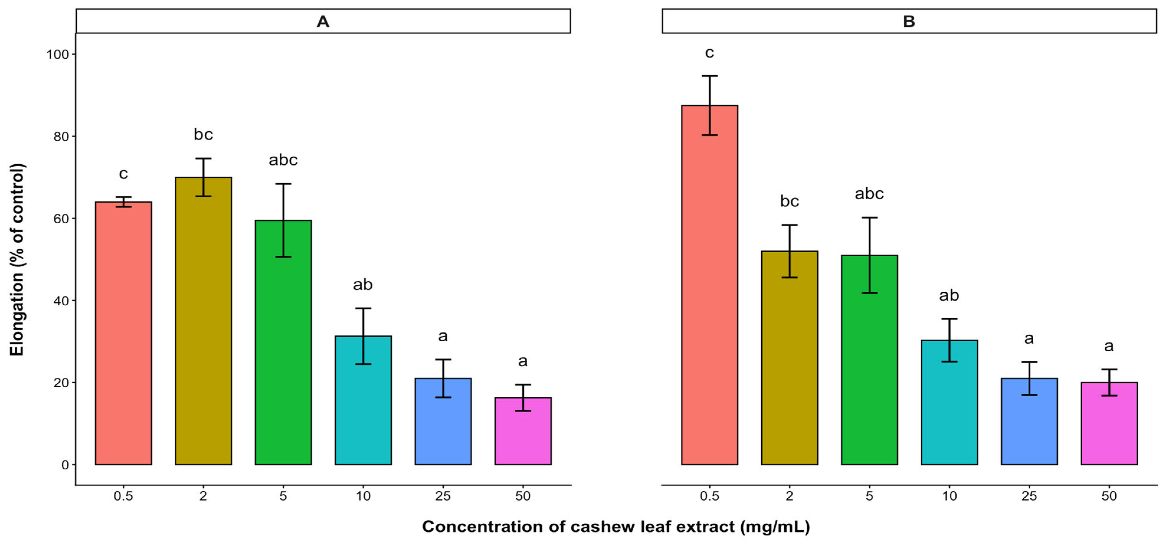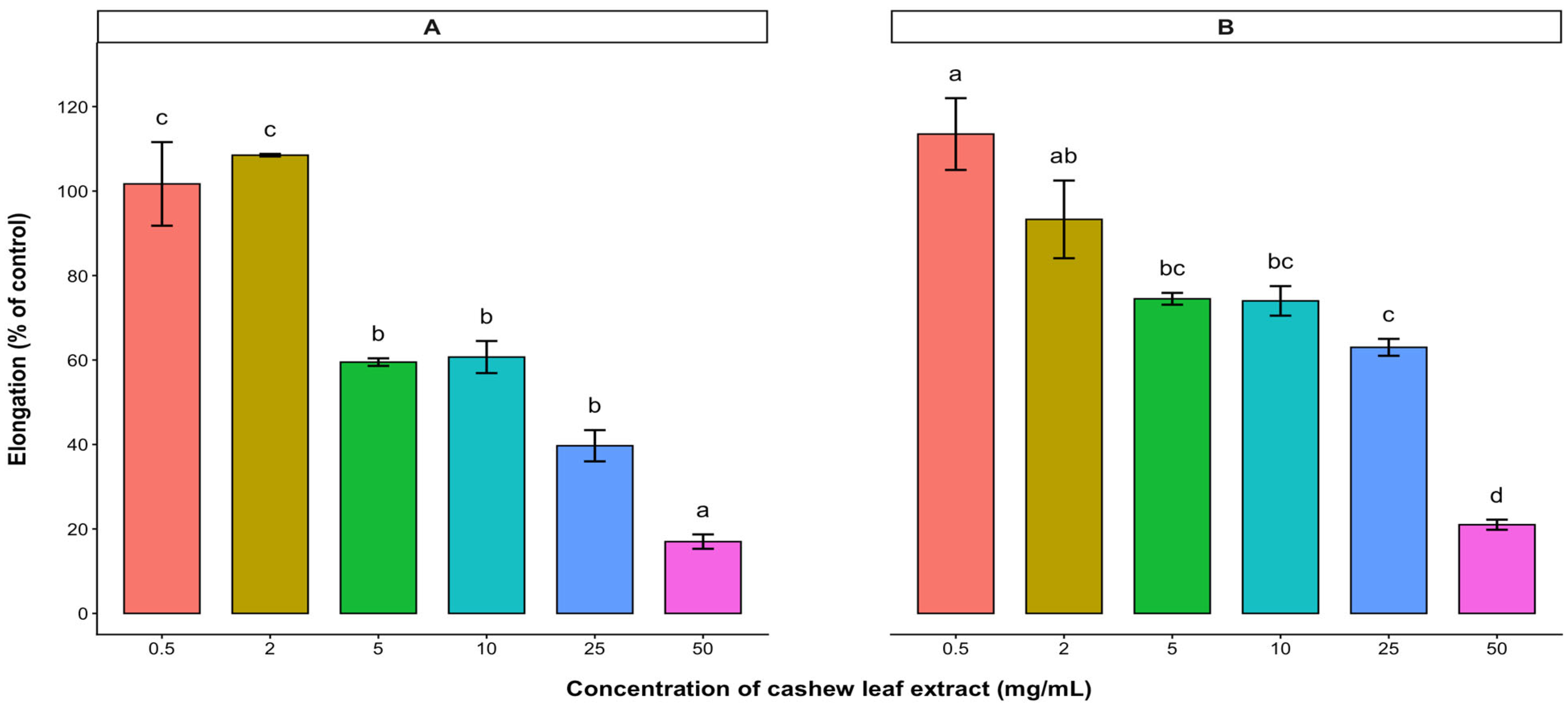 2.1. Effect of A. occidentale Leaves and Stem Bark on the Radicle and Hypocotyl Elongations of Lettuce