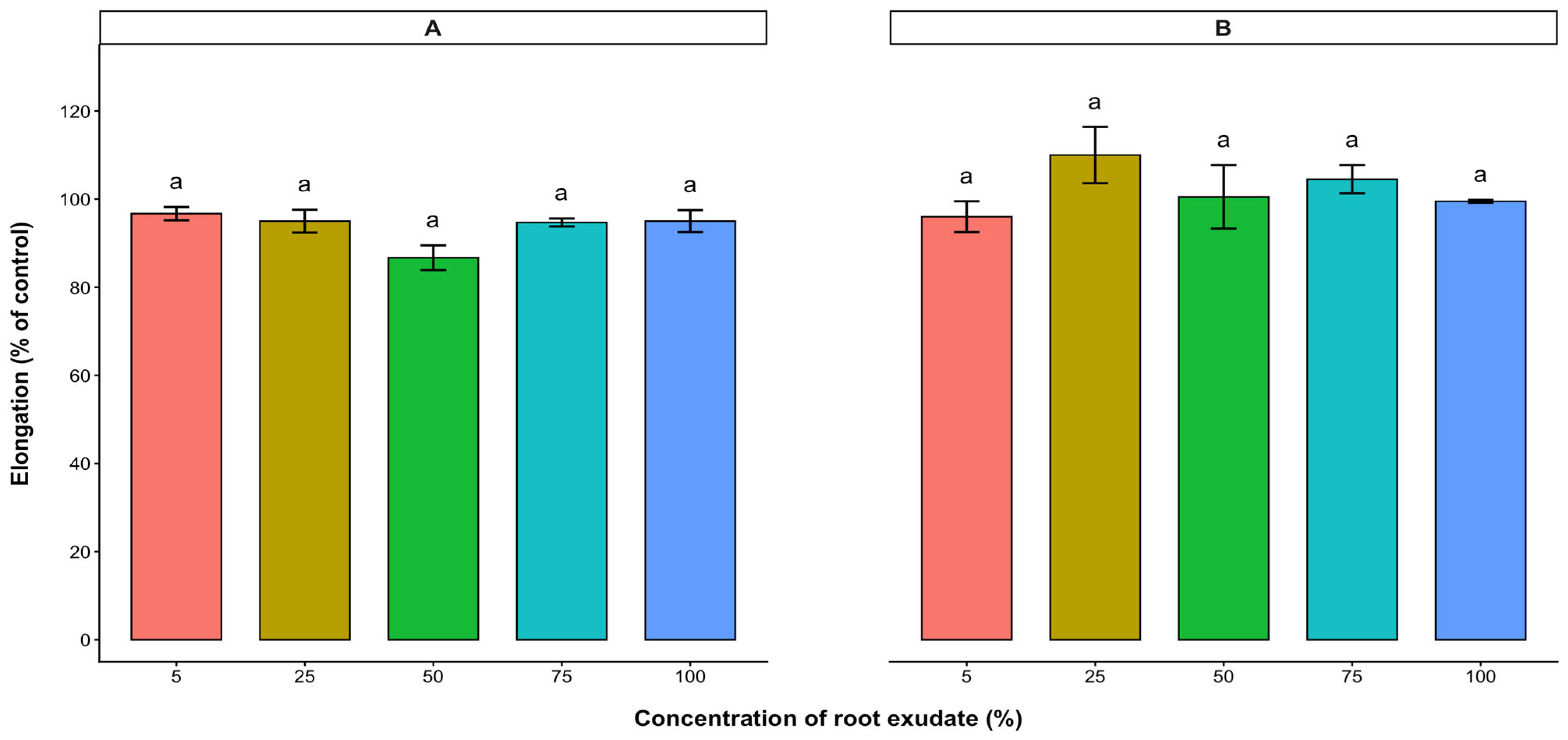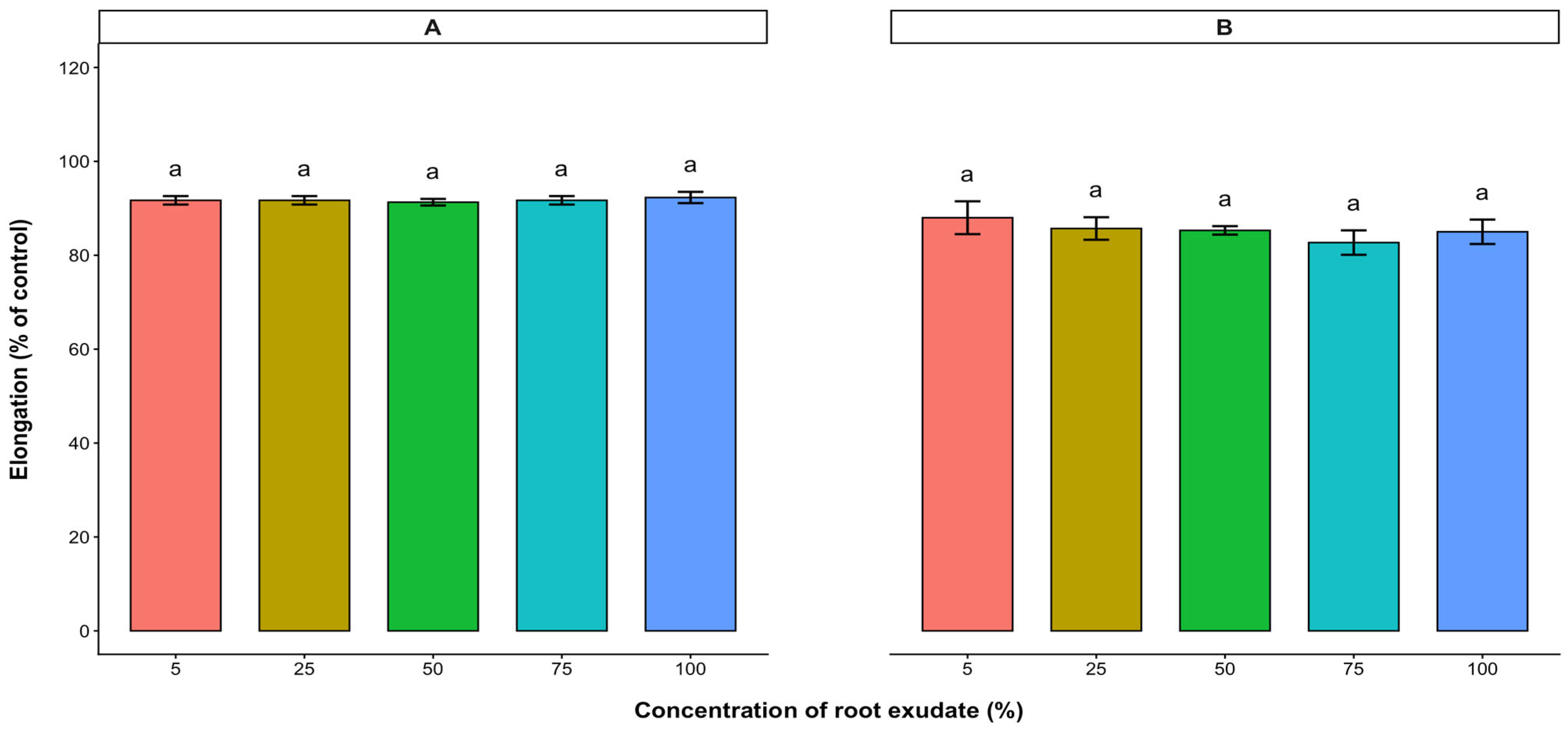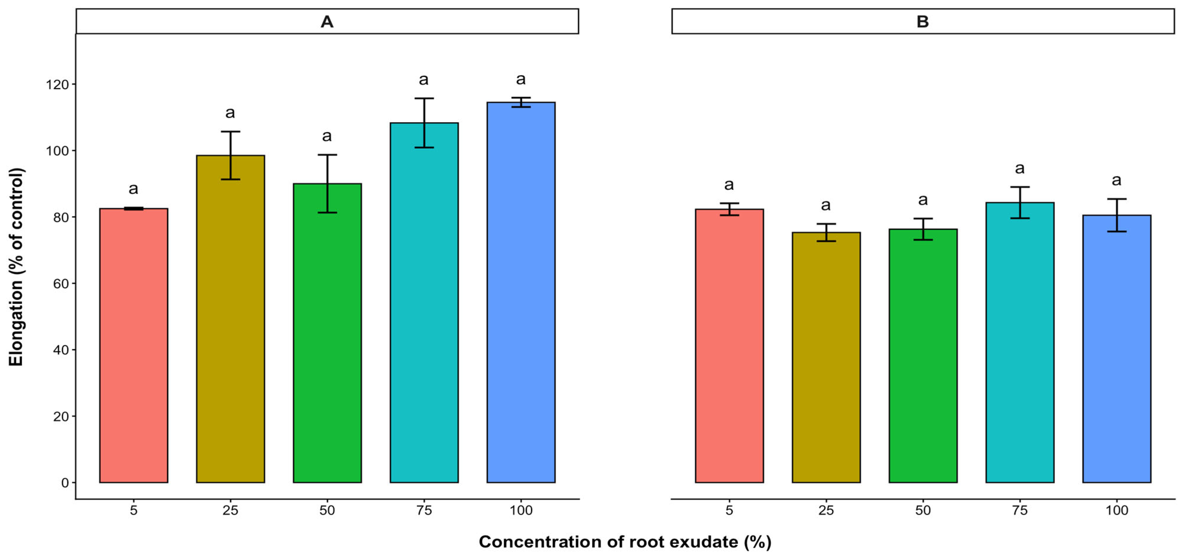 2.4. Effects of Root Exudates of A. occidentale on the Radicle and Hypocotyl Elongations of Lettuce, Tomato, and Pepper