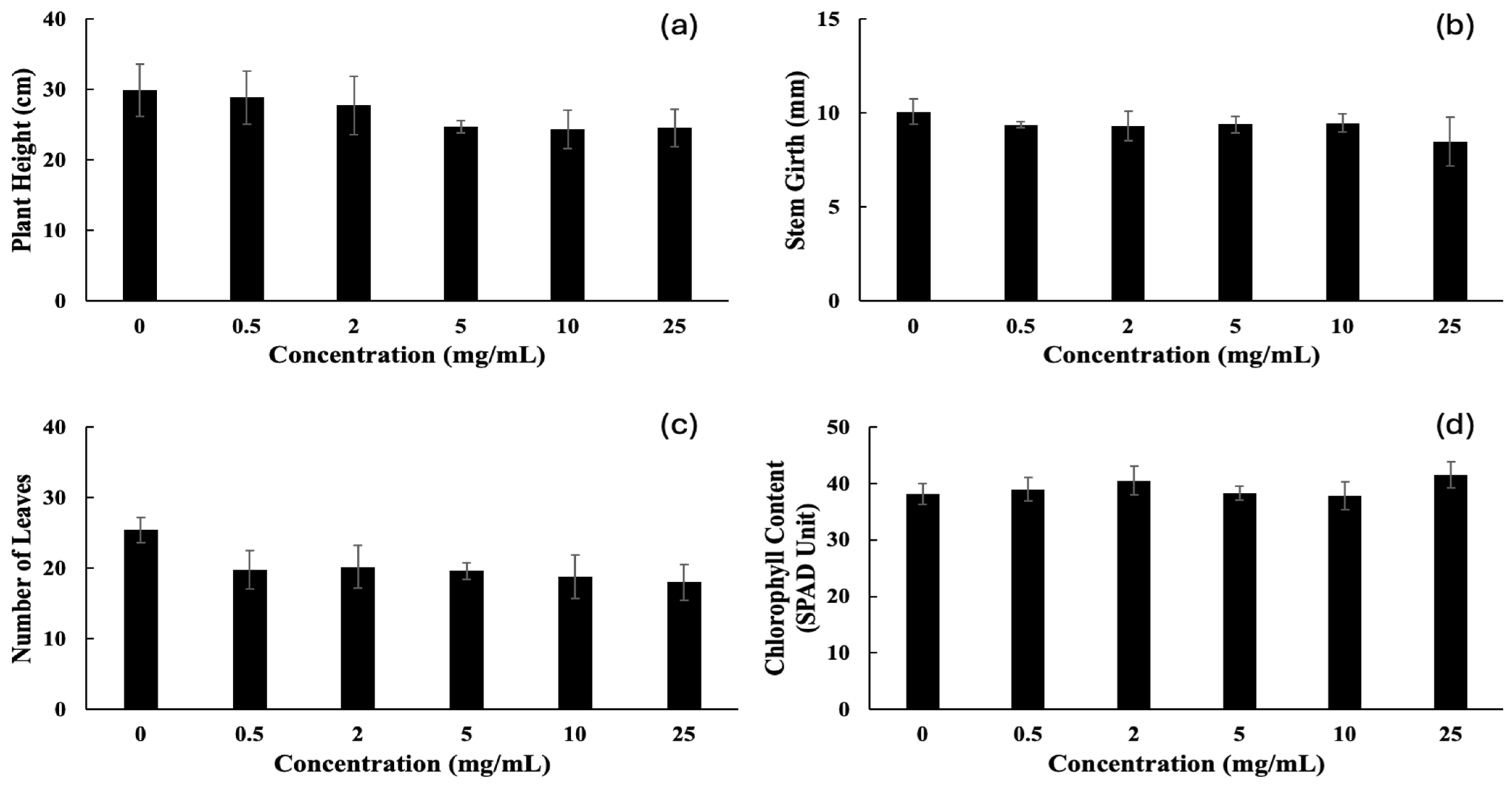 | Concentration (mg/mL) | SL (cm) | RL (cm) | FSW (g) | FRW (g) | DSW (g) | DRW (g) | RV (mL) |