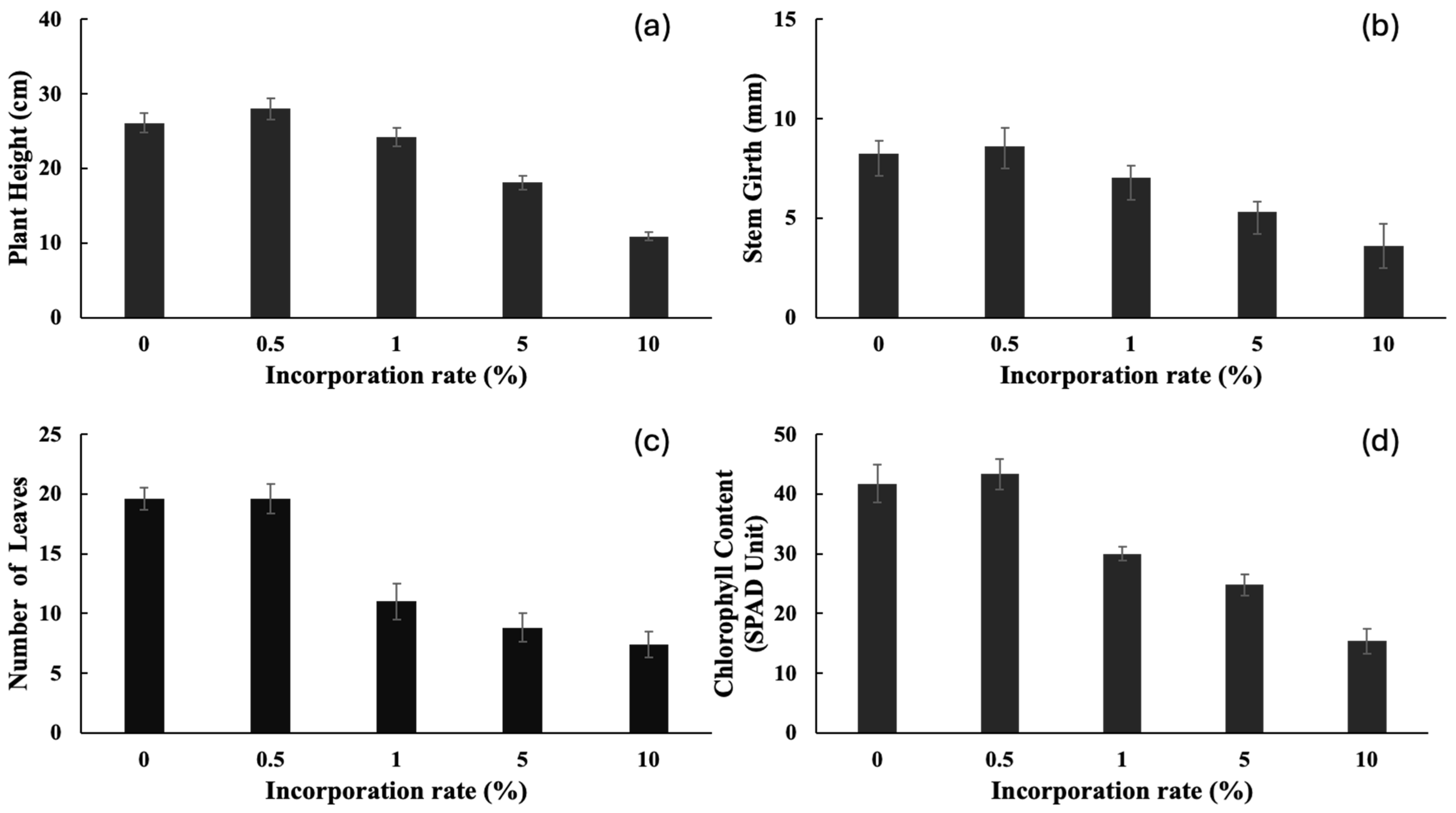 | Incorporation Rate (%) | SL (cm) | RL (cm) | FSW (g) | FRW (g) | DSW (g) | DRW (g) | RV (mL) |