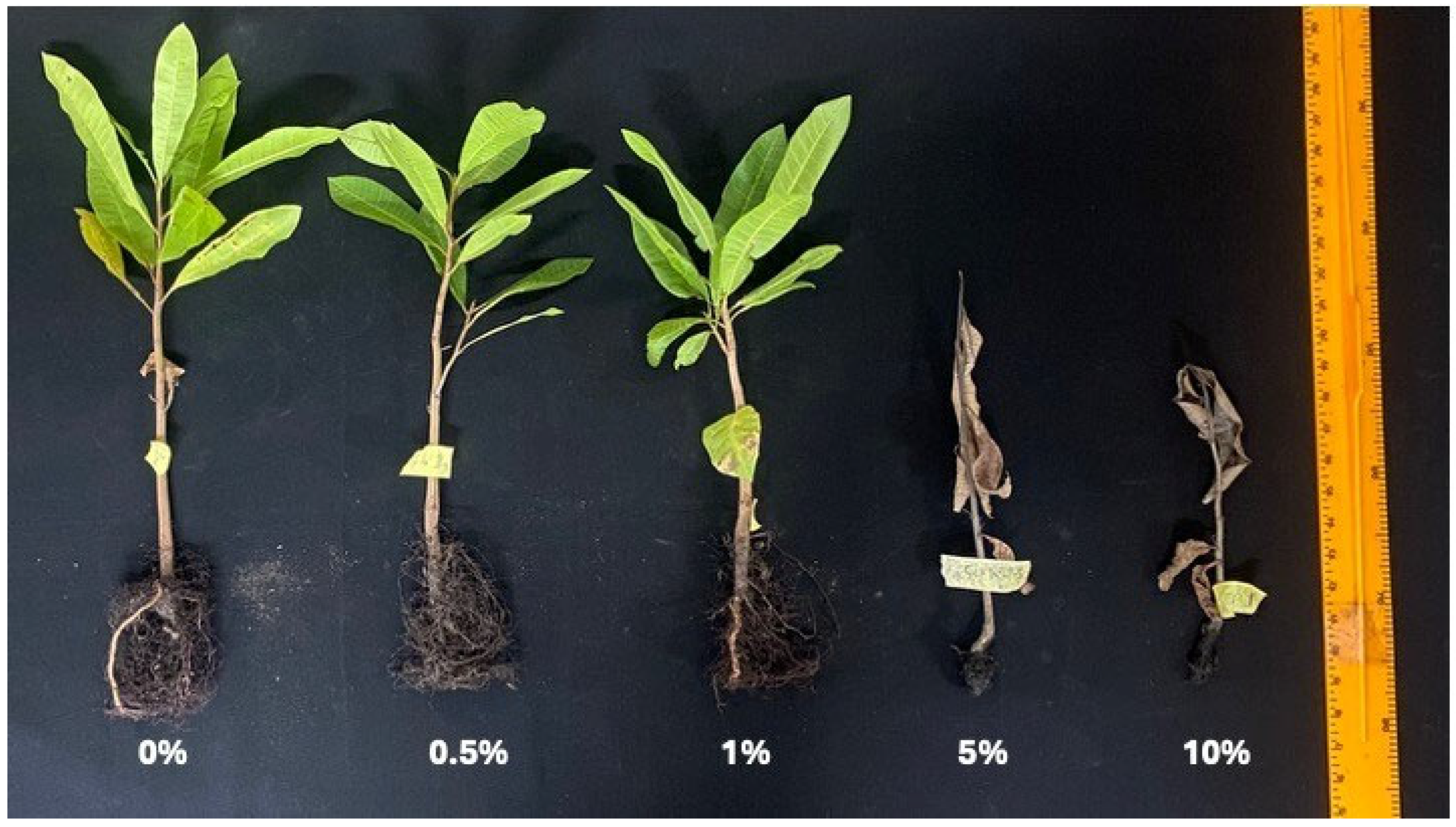 2.5. Evaluating the Potential Autotoxic Effect of Cashew Aqueous Leaf Extract and Powder on Cashew Seedlings