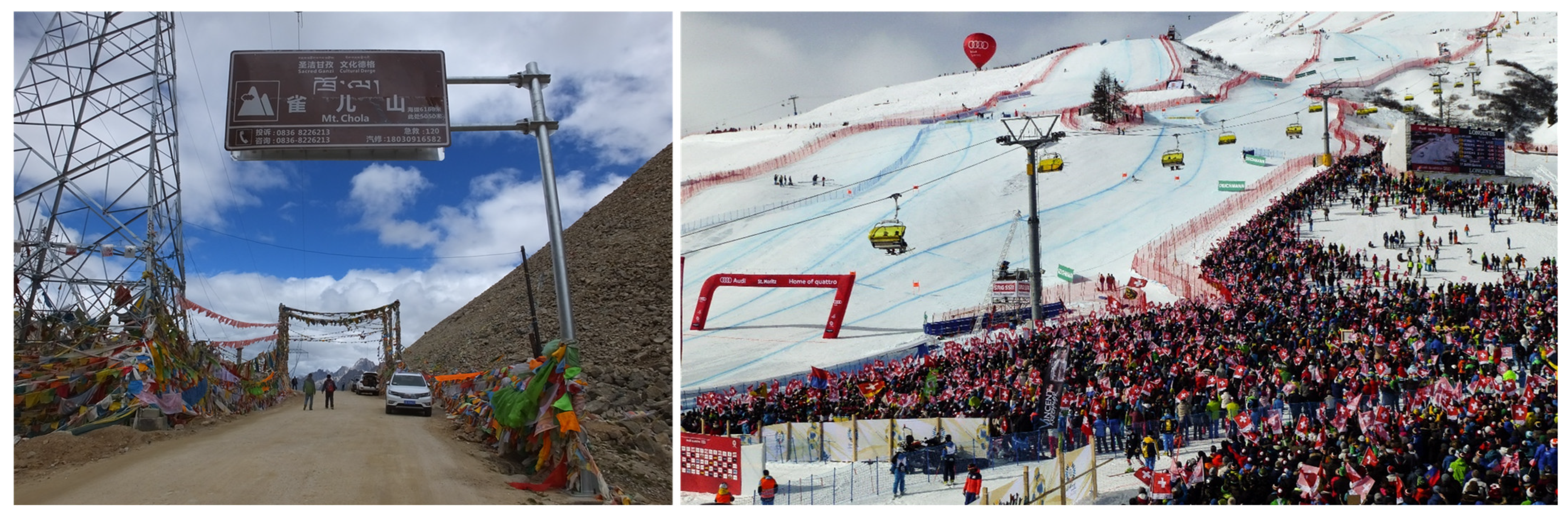 Figure 1. Anthropogenic development of mountain areas is increasing the risk of biological invasions. (Left), Chola mountain pass (W Sichuan, China), at 5050 m a.s.l., one of the highest in the region (photograph: J. López-Pujol). China planned to build or upgrade 100,000 km of rural roads (of which a large part is in mountainous areas) just during the year 2025 [52]. (Right), a ski resort in St. Moritz, Switzerland (photograph: Wikipedia [53]). Globally, there are over 5700 ski resorts [36].