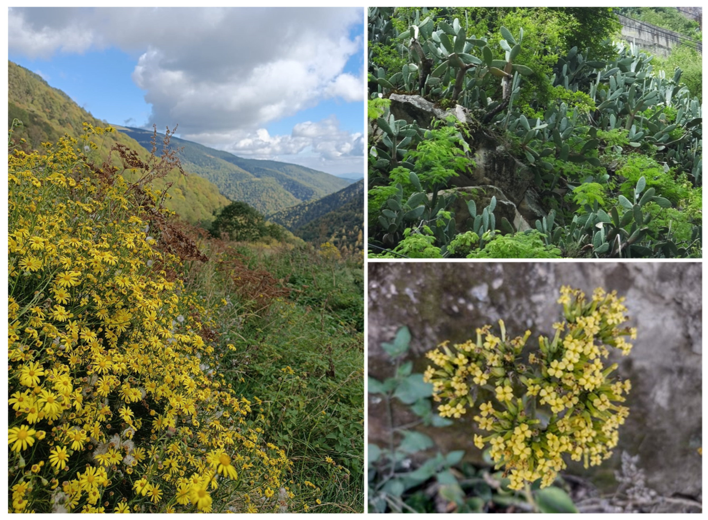 However, unlike other regions where mountain ecosystems have remained relatively intact until recent times, Mediterranean mountains have been profoundly shaped by human activities over millennia [83,90]; see [91] for visualizing the anthropogenic ecological transformations over time of the varied mountainous areas in the world. These long-standing anthropogenic impacts—now intensifying—combined with climate change, which is expected to severely affect the Mediterranean Basin and its mountain environments [92], pose serious challenges for the conservation of these ecosystems. In turn, this makes the Mediterranean Basin particularly vulnerable to biological invasions [93]. The combination of high connectivity, intense human activity, and climatic conditions favorable to many alien species has already facilitated their introduction and spread into high-altitude Mediterranean environments. Invasive plants such as Ailanthus altissima, Robinia pseudoacacia and Senecio inaequidens (see a picture of the latter in Figure 2) are already altering native plant communities in several Mediterranean mountain systems [94,95]. For example, in Vesuvius Volcano National Park (southern Italy), R. pseudoacacia has spread widely after disturbances such as wildfires, colonizing Castanea sativa stands and potentially displacing native vegetation through vigorous sprouting and root suckering [96]. Although Mediterranean mountains are currently less affected by invasive species than lowlands, which host most invasion hotspots, this situation will change significantly in the near future. Multispecies SDMs indicate that invasions will become a serious issue in mountainous areas in the northern part of the Mediterranean Basin [97].