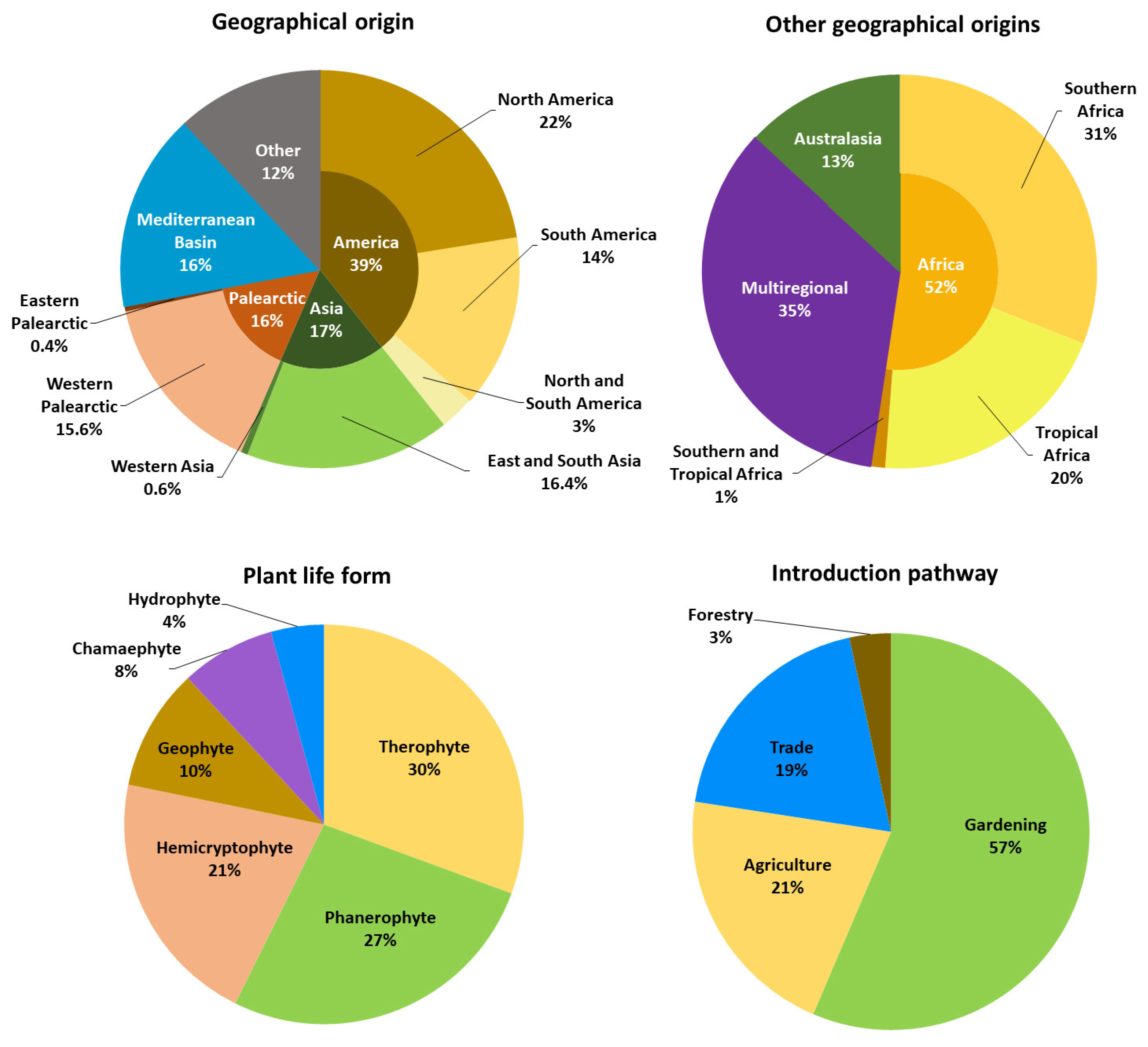 Figure 4. Graphics representing geographical origin, introduction pathway and plant life forms of alien plant taxa of the Pyrenees. In relation to geographical origin, taxa with no clear geographical origin (hybrid and cultivated taxa, 53 in total) were excluded. The classification of geographic origins and introduction pathways is based on Aymerich and Sáez (2019) [109].