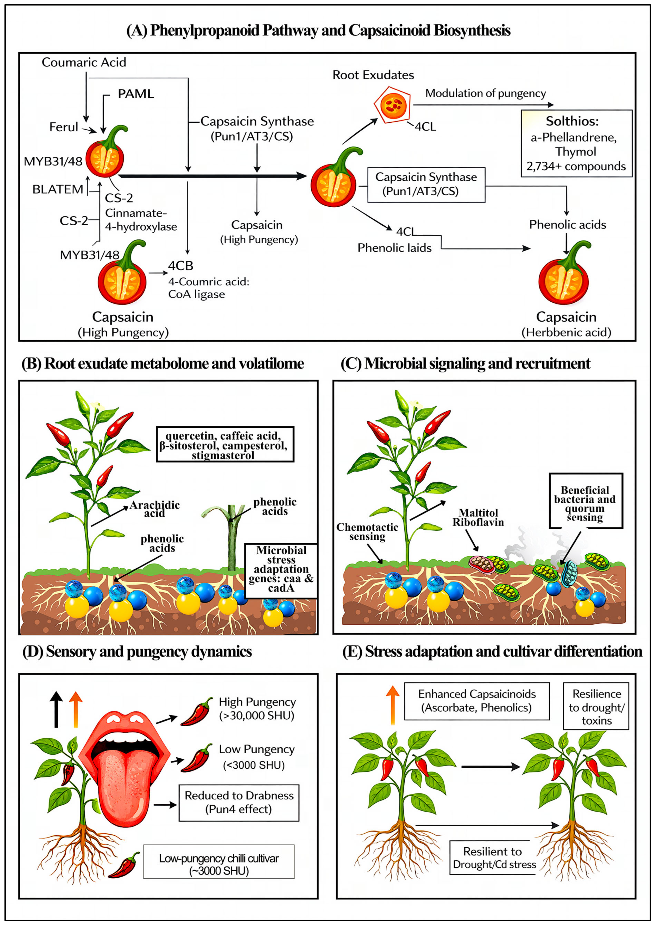- Das, S.; Sarkar, S.; Das, M.; Banik, P.; Bhattacharya, S.S. Influence of soil quality factors on capsaicin biosynthesis, pungency, yield, and produce quality of chilli: An insight into Csy1, Pun1, and Pun12 signalling responses. Plant Physiol. Biochem. 2021, 166, 427–436. [Google Scholar] [CrossRef]