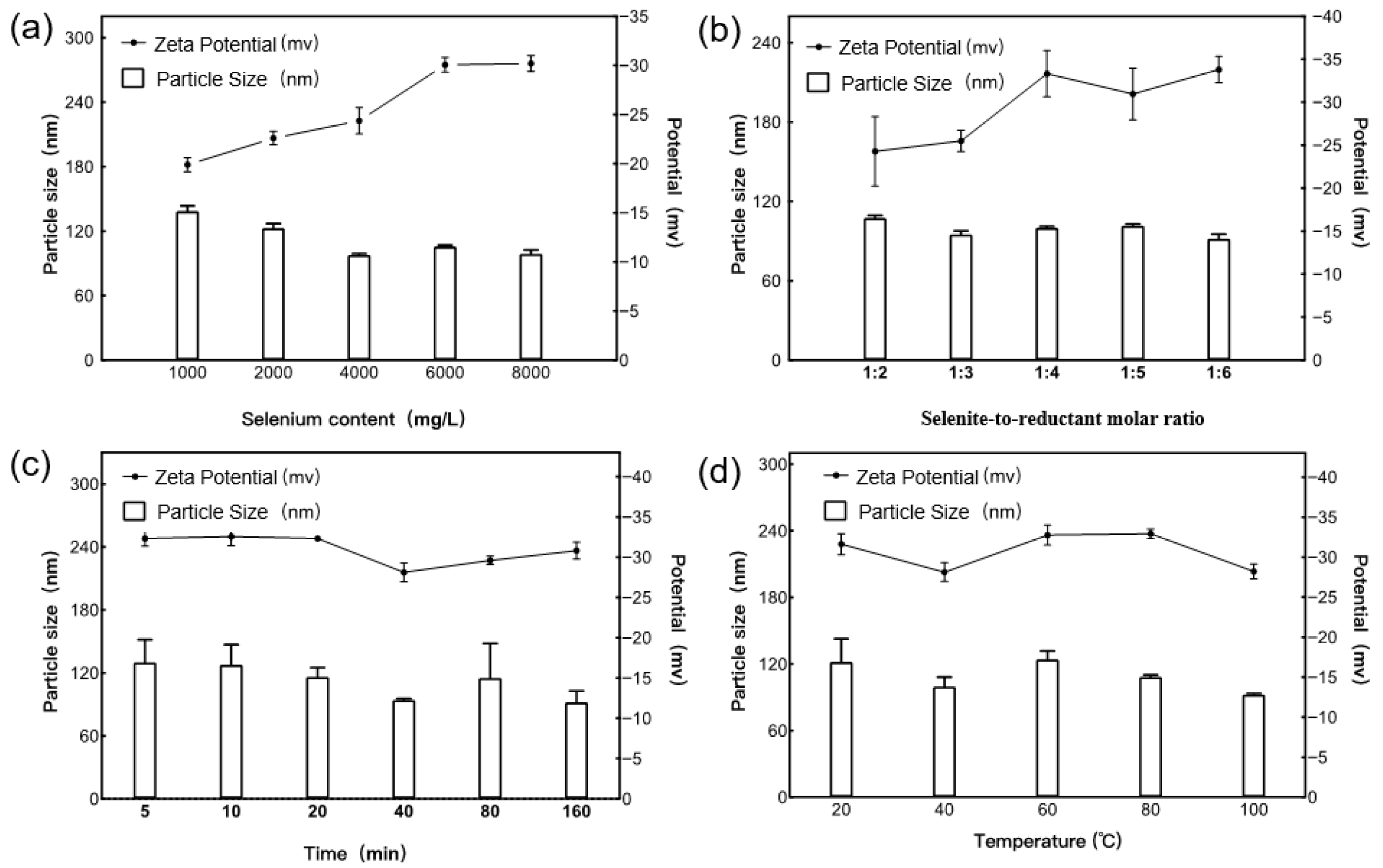 | Run | Selenium Concentration (mg/L) | Selenite-to-Reductant Ratio (%) | Temperature (°C) | Particle Size (nm) |