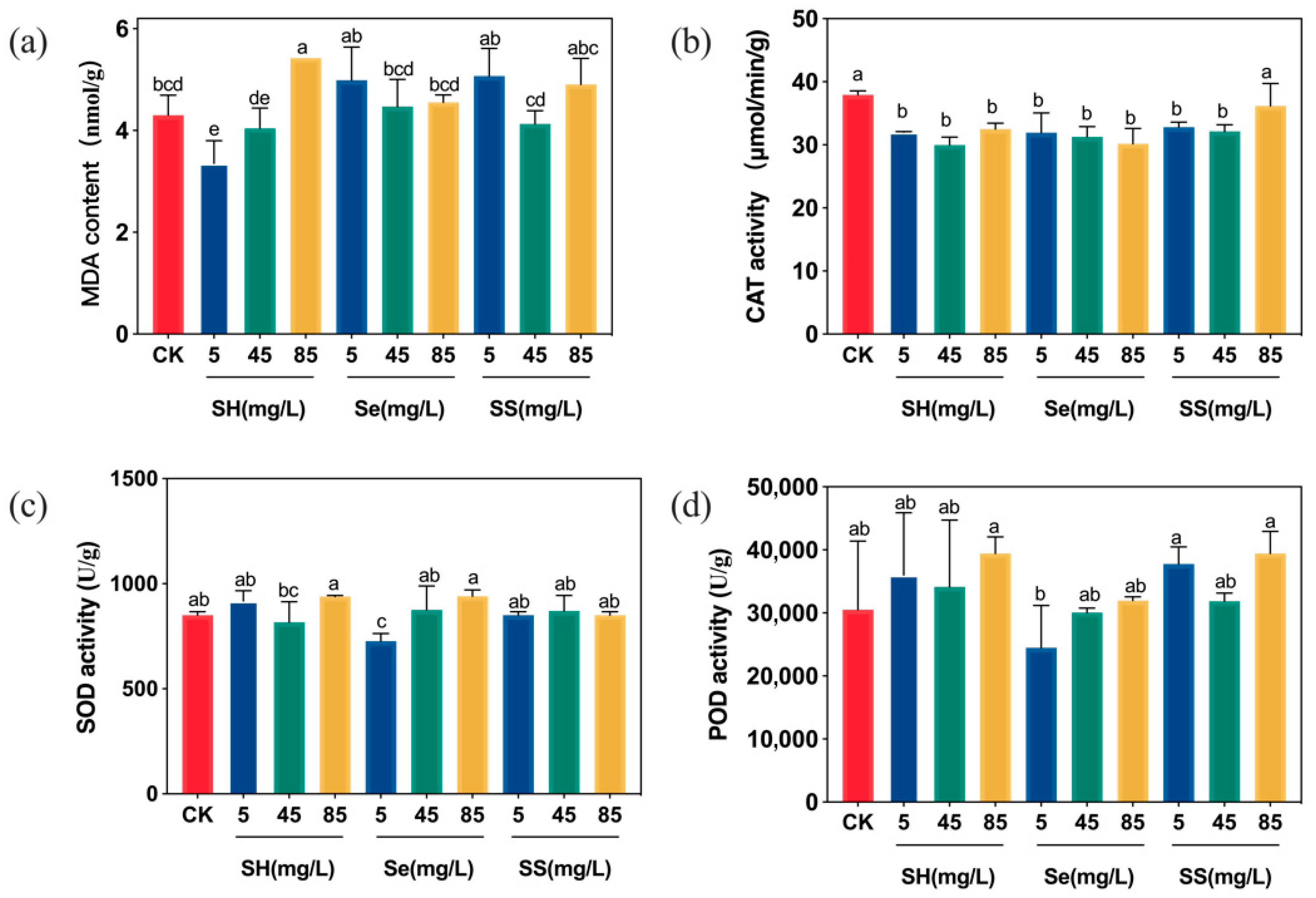 - Hasanuzzaman, M.; Bhuyan, M.B.; Zulfiqar, F.; Raza, A.; Mohsin, S.M.; Mahmud, J.A.; Fujita, M.; Fotopoulos, V. Reactive oxygen species and antioxidant defense in plants under abiotic stress: Revisiting the crucial role of a universal defense regulator. Antioxidants 2020, 9, 681. [Google Scholar] [CrossRef] [PubMed]
