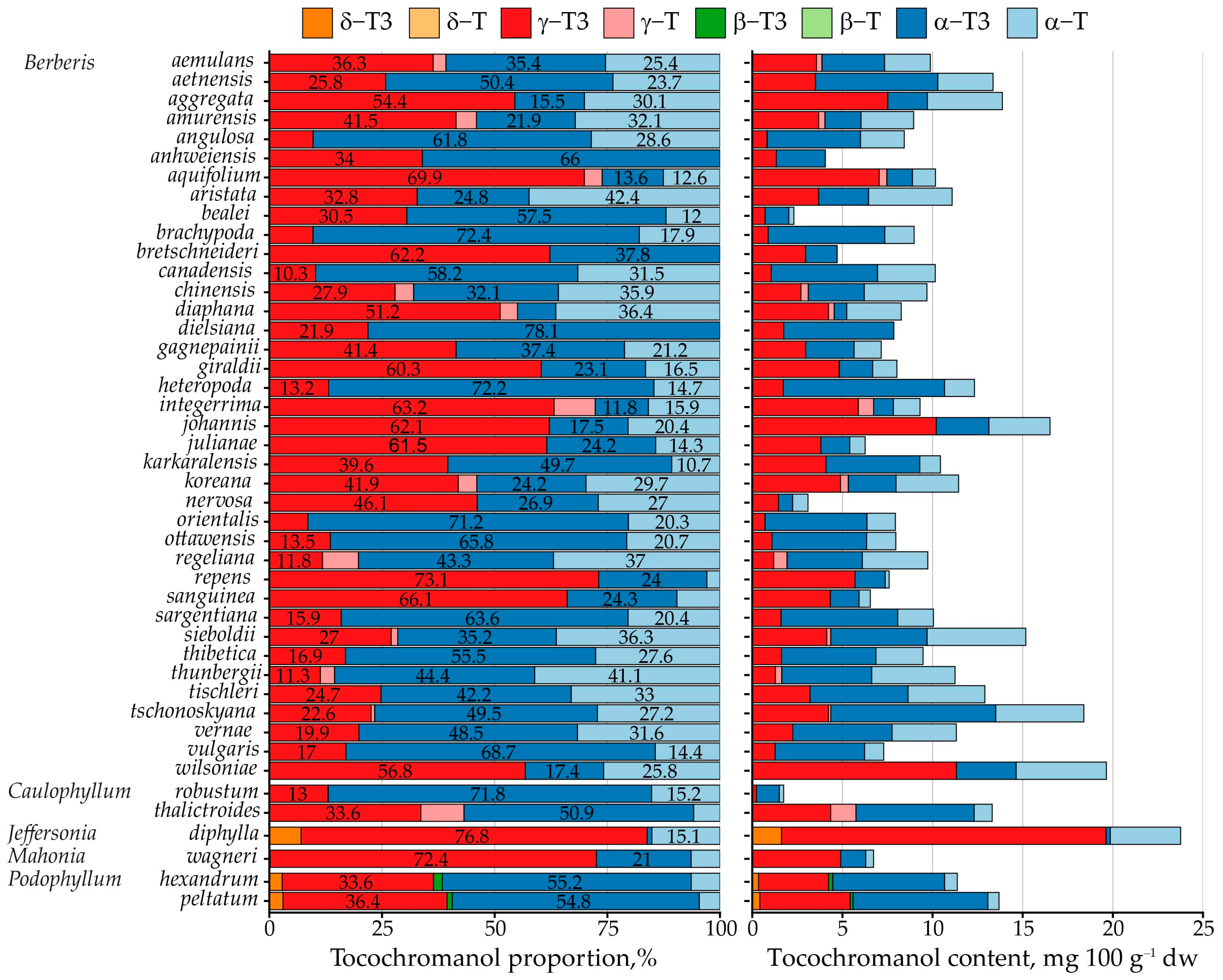 | Genus | Species | γ-T3 | α-T3 | γ-T | α-T | Sum | Ratio γ/α-T3 | Ratio T3s/Ts |