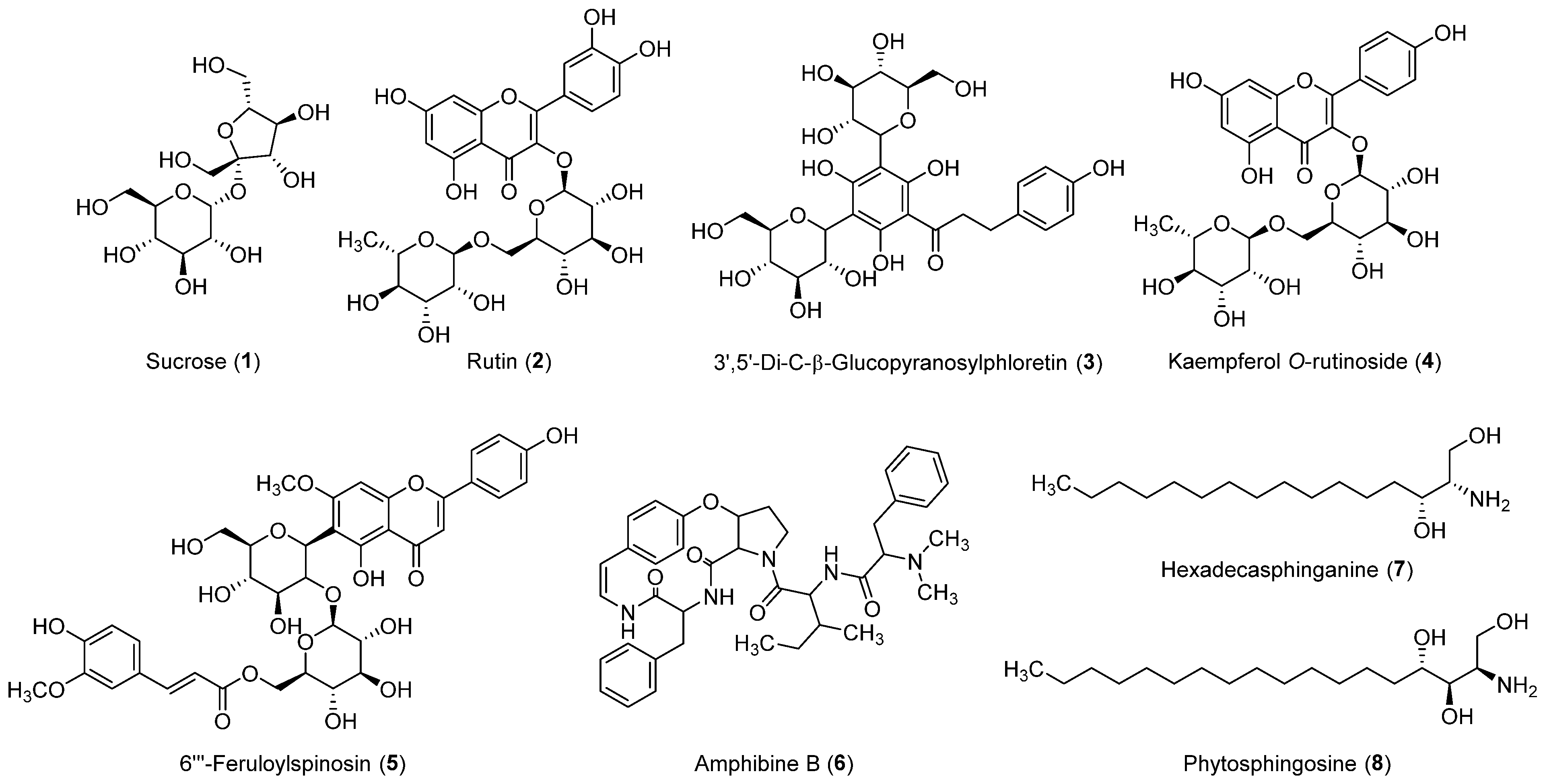 - Renault, J.H.; Ghedira, K.; Thépenier, P.; Lavaud, C.; Zèches-Hanrot, M.; Le Men-Olivier, L. Dammarane saponins from Zizyphus lotus. Phytochemistry 1997, 44, 1321–1327. [Google Scholar] [CrossRef]