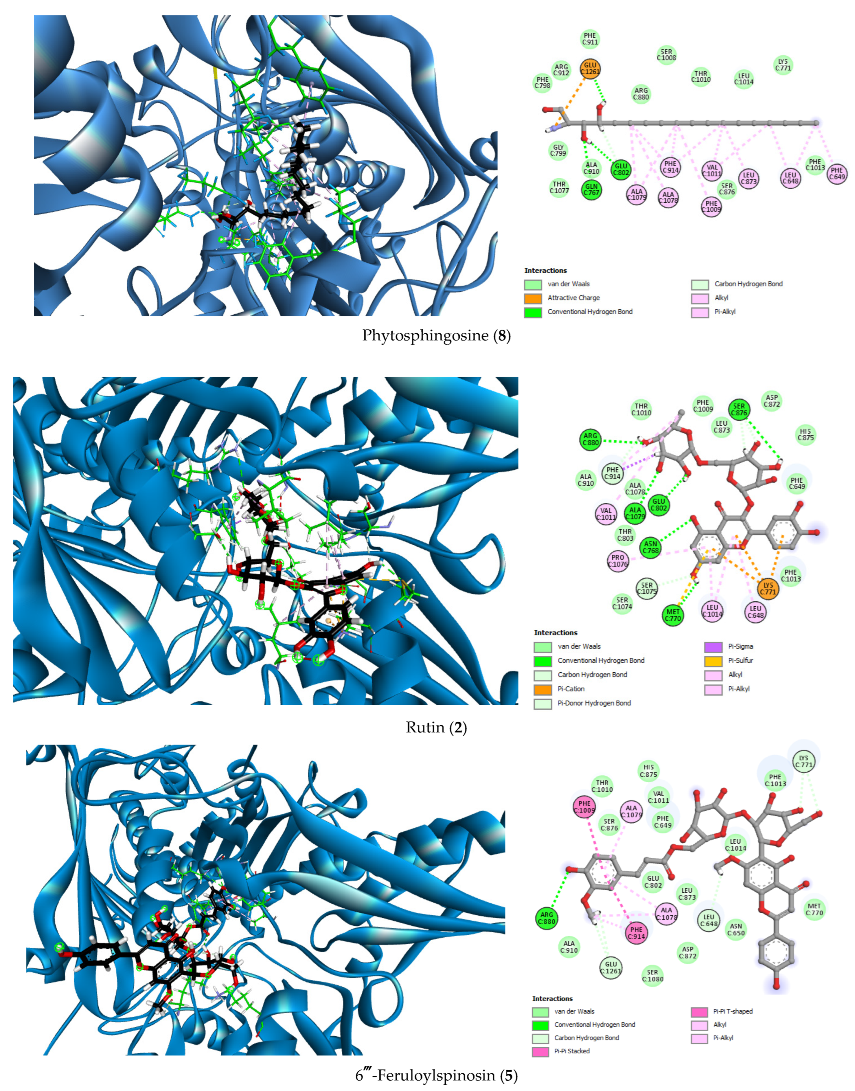 | 6‴-Feruloylspinosin (5) | −7.8 | Arg880 (2.91), Glu1261 (2.63), Glu1261 (2.84), Leu648 (2.58), Lys771 (2.18), Lys771 (2.81) | Phe1009, Ala1079, Ala1078 (2), Phe914 (2) | - |