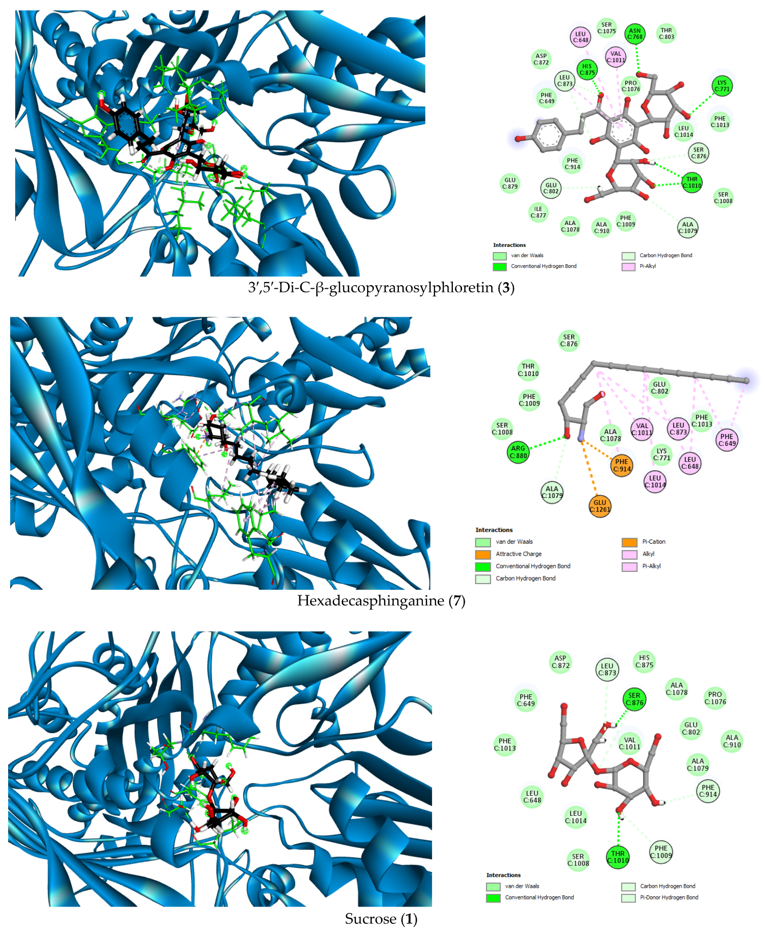| Sucrose (1) | −7.0 | Leu873, Ser876, Ser867, Thr1010, Phe1009, Phe914 | - | - |