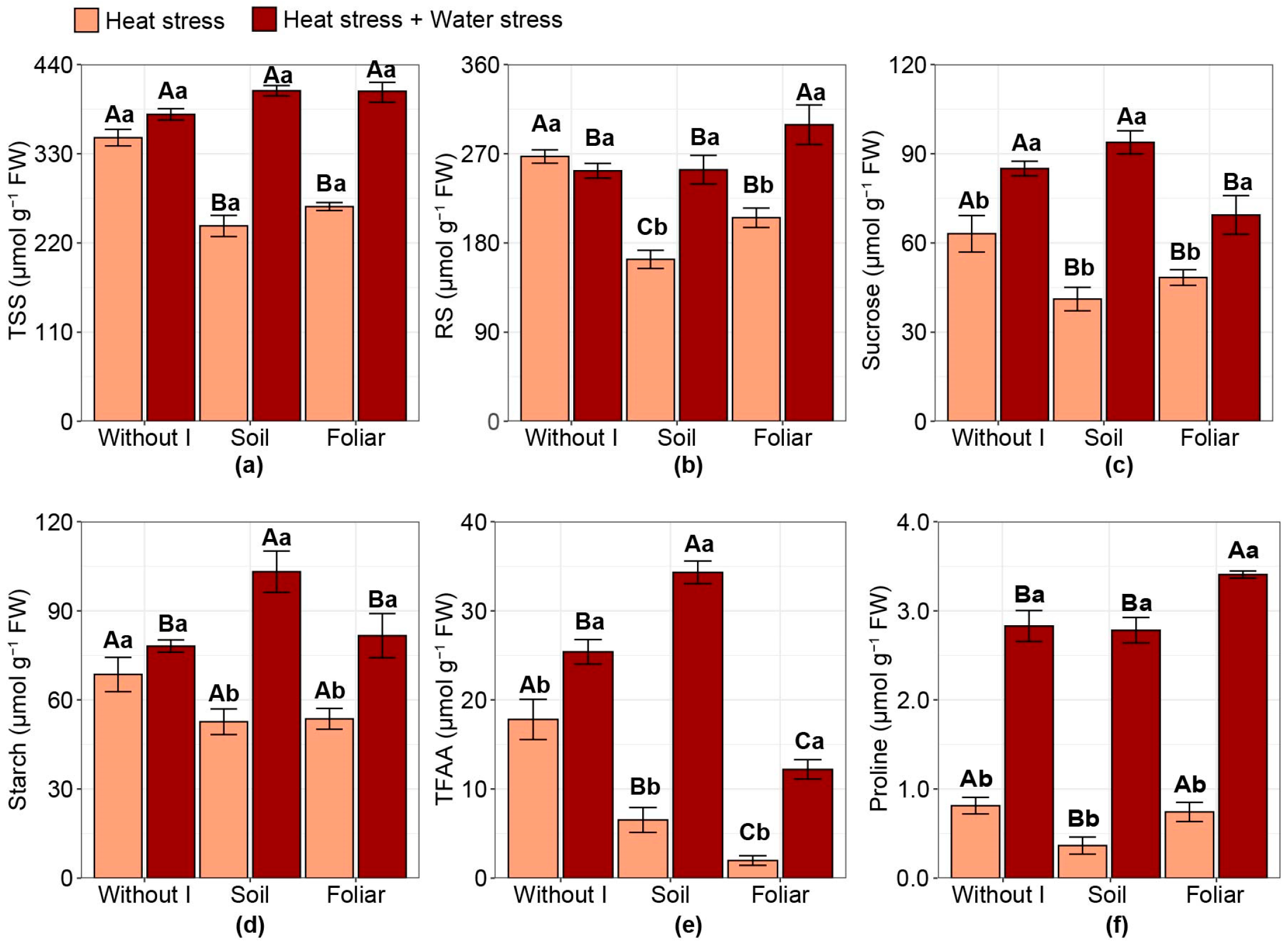 | T6 | Foliar iodine application (200 g of iodine ha−1) | Heat stress + Water stress |