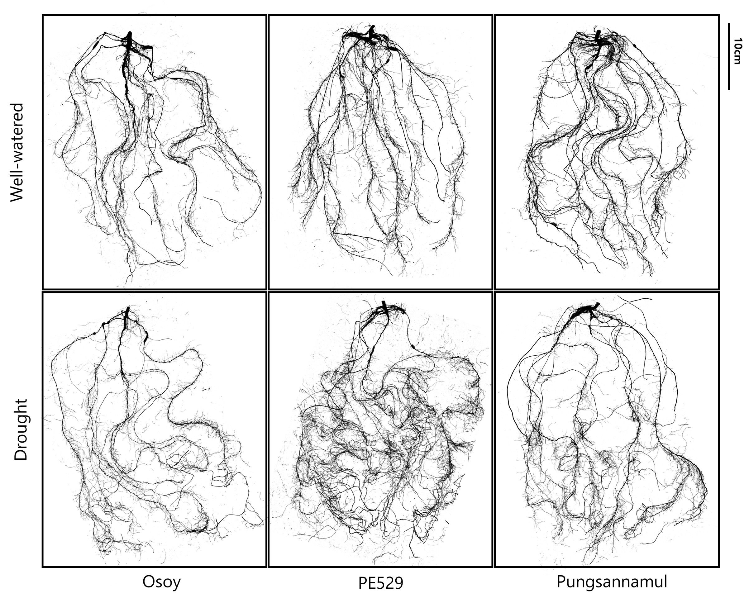 | Root Volume | Root volume calculated from diameter measurements for all pixels along the root, representing three-dimensional root biomass investment |