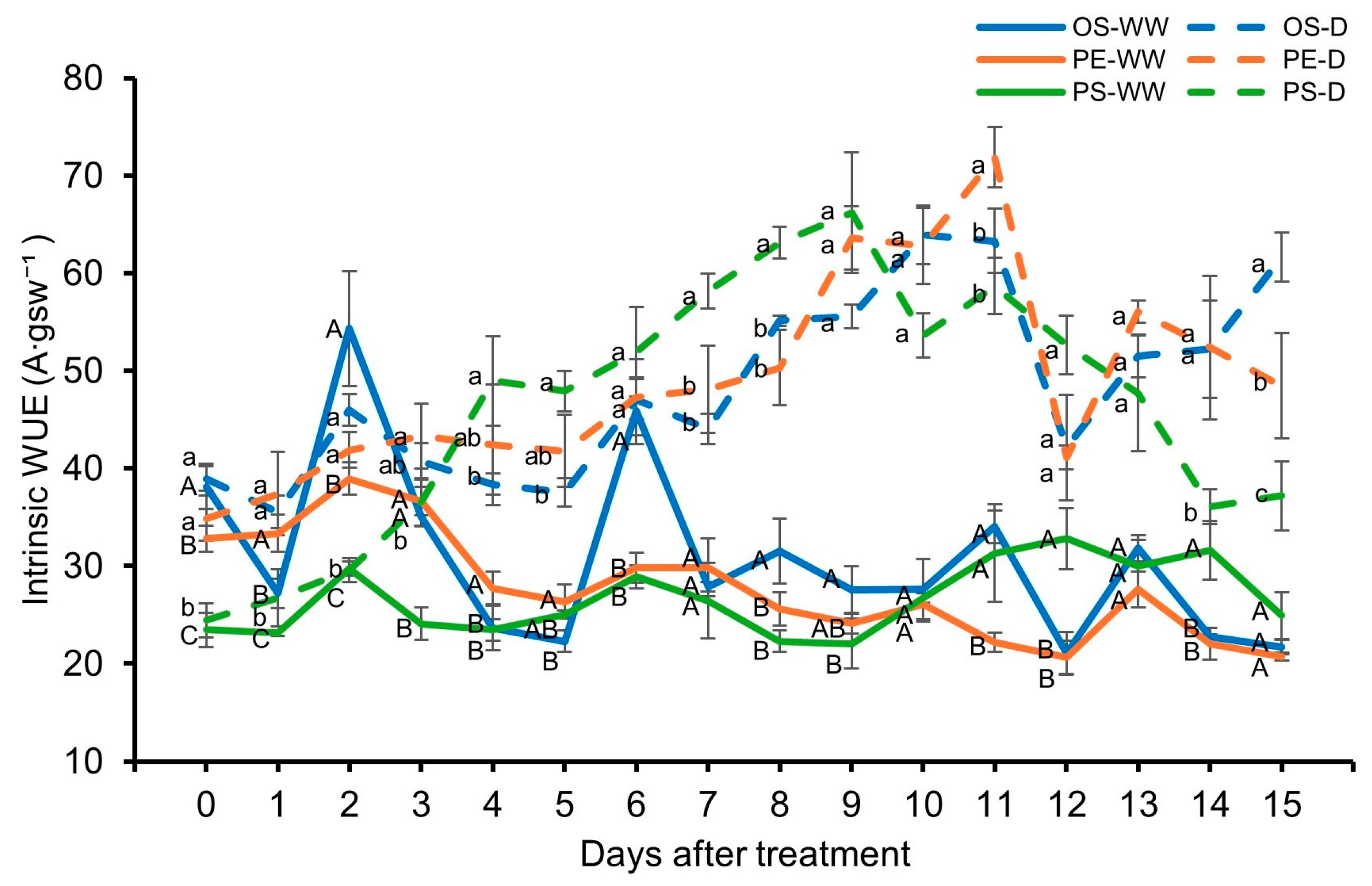 | Intrinsic water use efficiency | Index describing carbon gain per unit stomatal conductance, calculated as the ratio of net CO2 assimilation rate to stomatal conductance to water vapor |