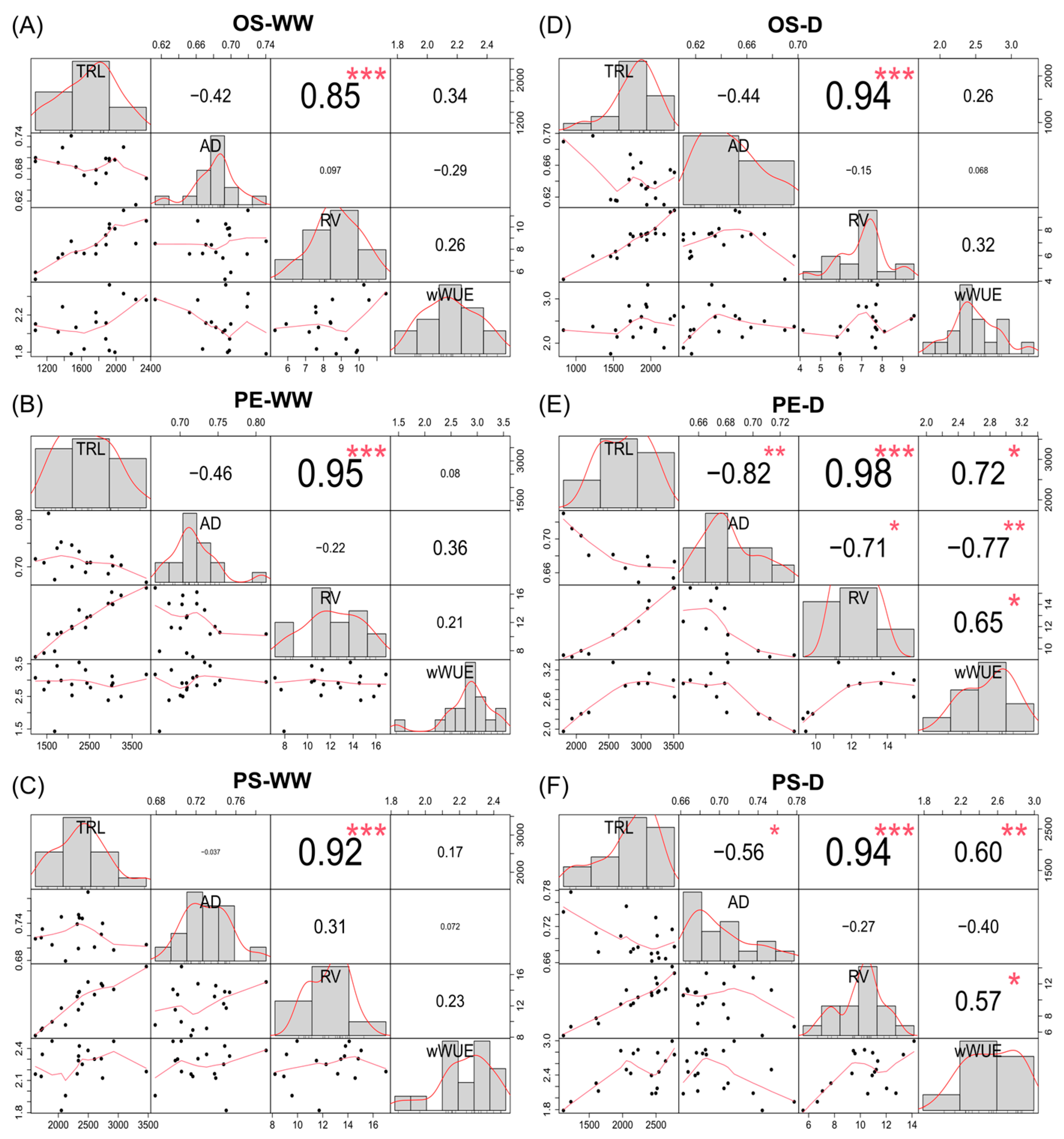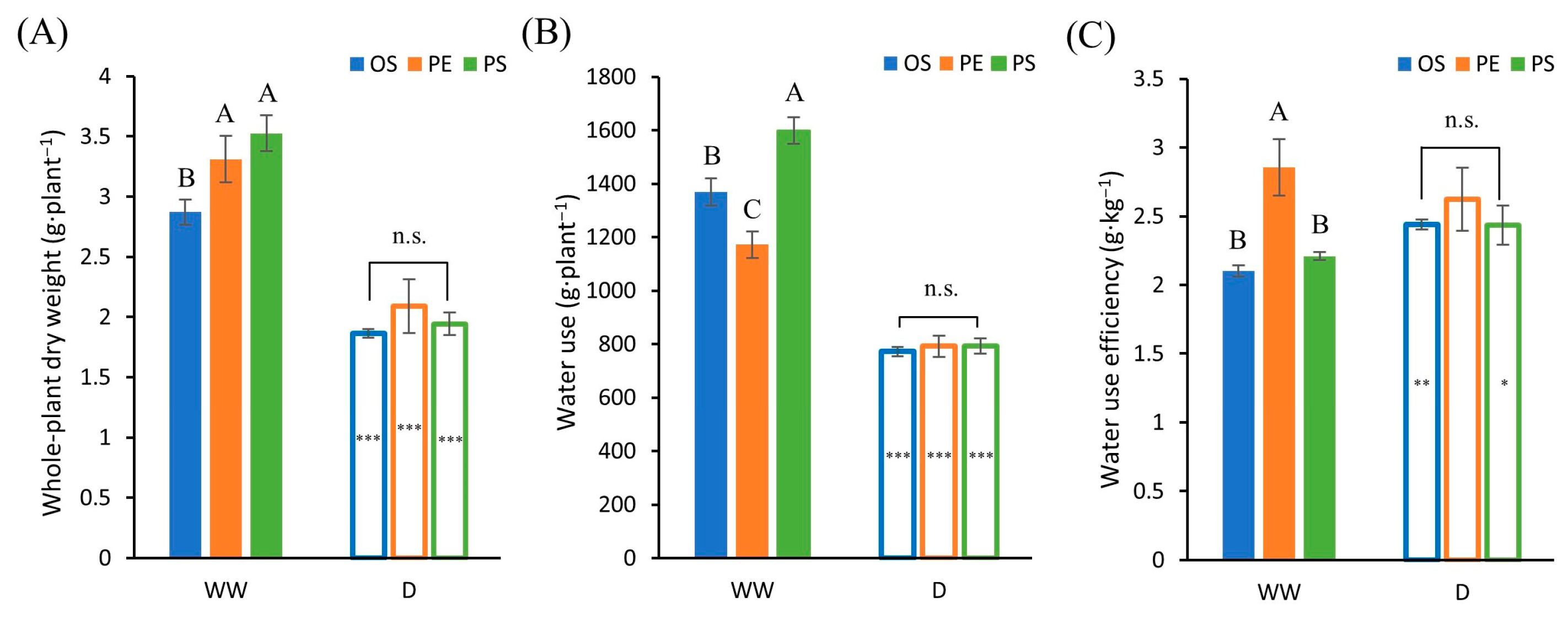 | Whole-plant Water use efficiency | 2 | 29.45 | <0.001 *** | 2 | 0.96 | 0.391 |