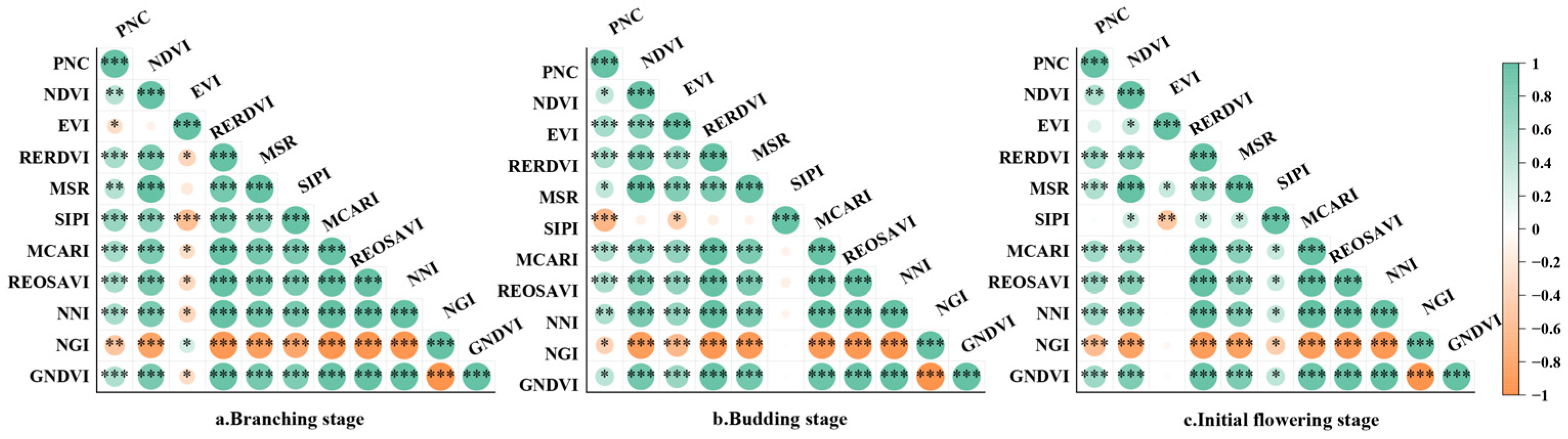 This study employed Pearson correlation analysis to investigate the relationships between vegetation indices, texture feature values, texture indices, and PNC. For each growth stage of alfalfa, vegetation indices with a correlation coefficient |r| > 0.5 and ranking among the top three in correlation strength were selected. Additionally, for each of the three texture index categories, one texture index with |r| > 0.5 and the highest correlation coefficient was chosen.