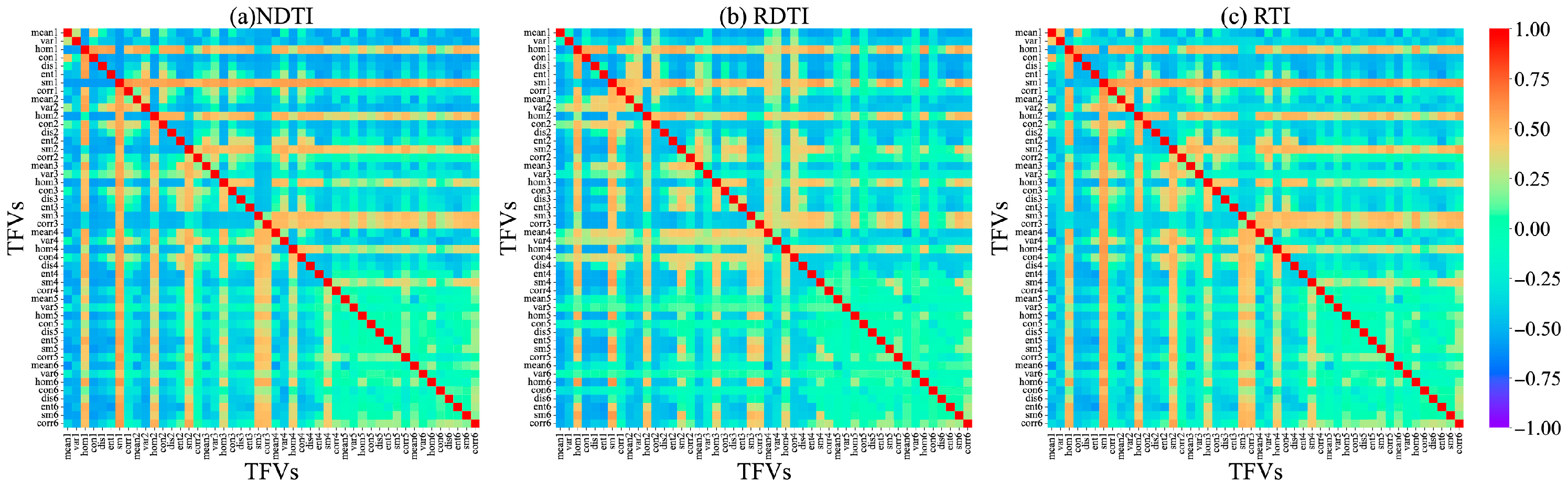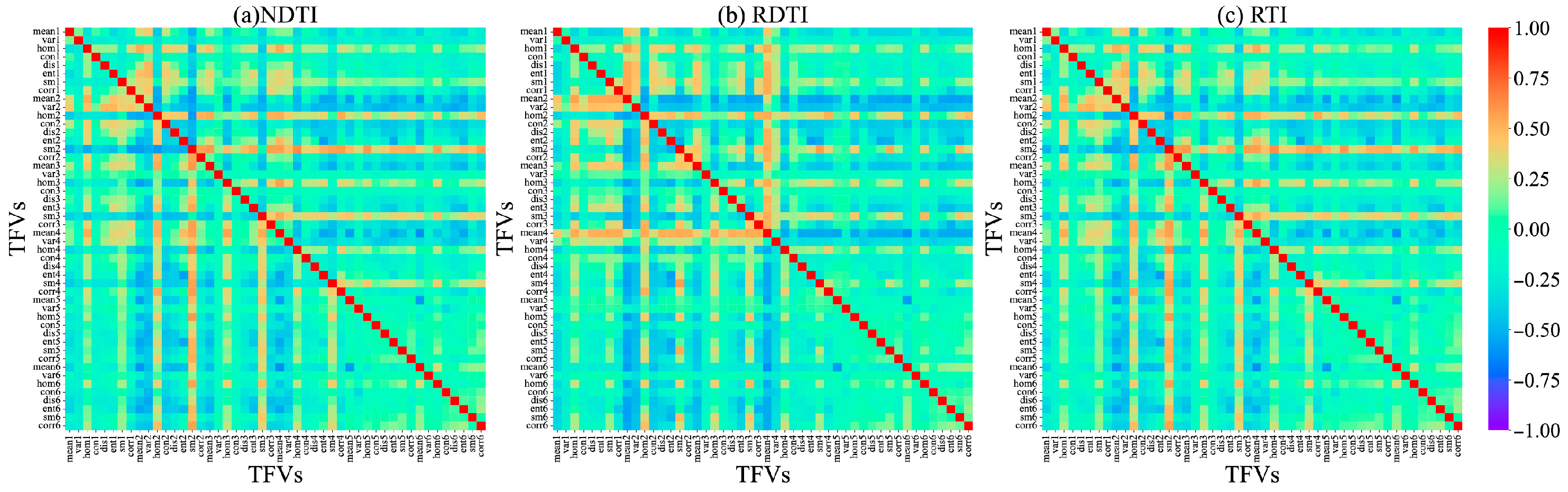 Three texture indices (TIs) constructed from TFV combinations are defined as follows: Normalized Difference Texture Index (NDTI), Ratio Texture Index (RTI), and Renormalized Difference Texture Index (RDTI). Their calculation formulas are as follows: