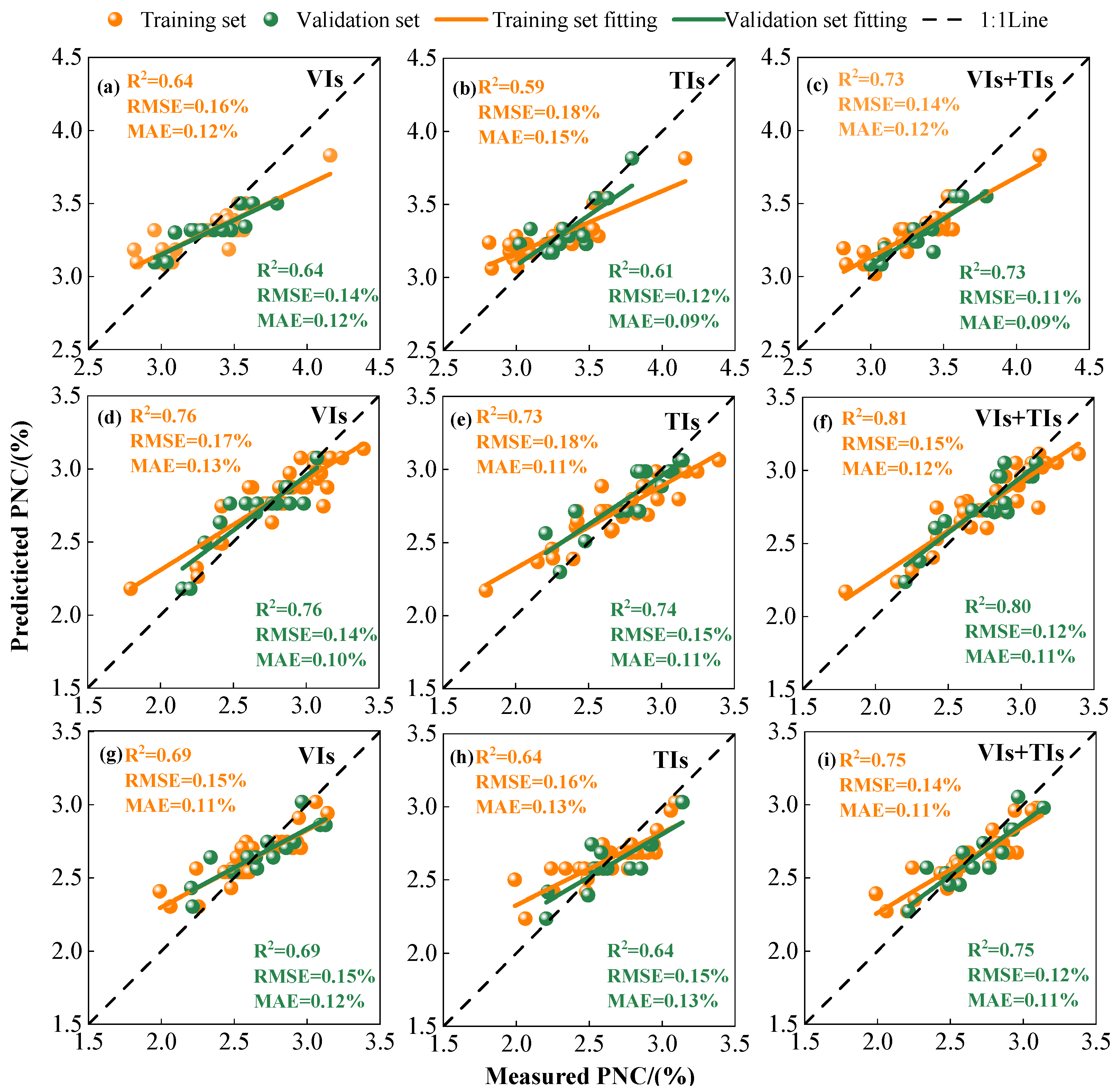 This study compared the prediction accuracy of four machine learning models—random forest regression (RFR), Support Vector Regression (SVR), BP neural network, and XG-Boost—on plant nitrogen content (PNC) across different growth stages and various input variables. The results indicate (Table 2) that during the branching stage, when using VIs as input variables, the XG-Boost model achieved validation set R2, RMSE, and MAE values of 0.64, 0.14%, and 0.12%, respectively. Its R2 outperformed RFR (0.58), SVR (0.56), and BPNN (0.53). When using TIs as input features, the accuracy of each model decreased slightly, but XG-Boost still maintained the highest accuracy (validation set R2 = 0.61). When integrating VIs and TIs as input variables, all models demonstrated significantly improved accuracy. Among them, XG-Boost showed the most pronounced enhancement, with training set R2 increasing by 14.1% compared to VIs alone and by 23.7% compared to TIs alone; validation set R2 improved by 14.1% over VIs and by 19.7% over TIs (Figure 7a–c).