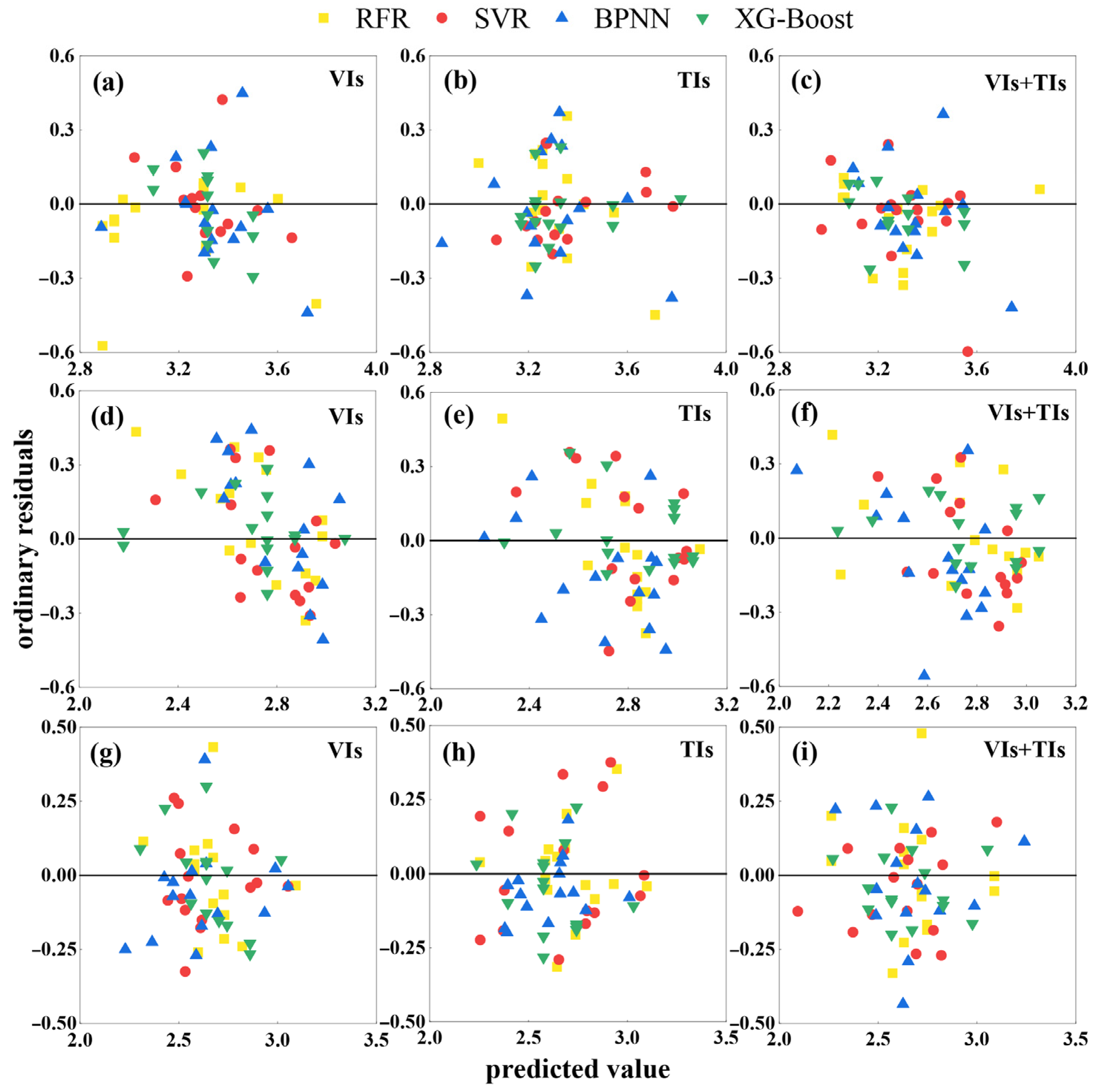 Residual analysis confirmed the performance of RFR, SVR, BPNN, and XG-Boost models using VIs, TIs, and VIs + TIs as input variables (Figure 8). Models using VIs or TIs as inputs exhibited scattered residual distributions. After integrating VIs + TIs, XG-Boost demonstrated the closest median residual to zero, the smallest interquartile range, and the fewest outliers across all three growth stages. While other models showed improved error distributions compared to single-feature models, their residual dispersion remained significantly higher than XG-Boost. Furthermore, residuals exhibited random distribution within the prediction range, indicating that model errors did not exhibit systematic variation with prediction magnitude, supporting the validity of the model’s design. Simultaneously, residuals fluctuated randomly around the zero line without trend-based clustering, ruling out the possibility of systematic errors in the model.