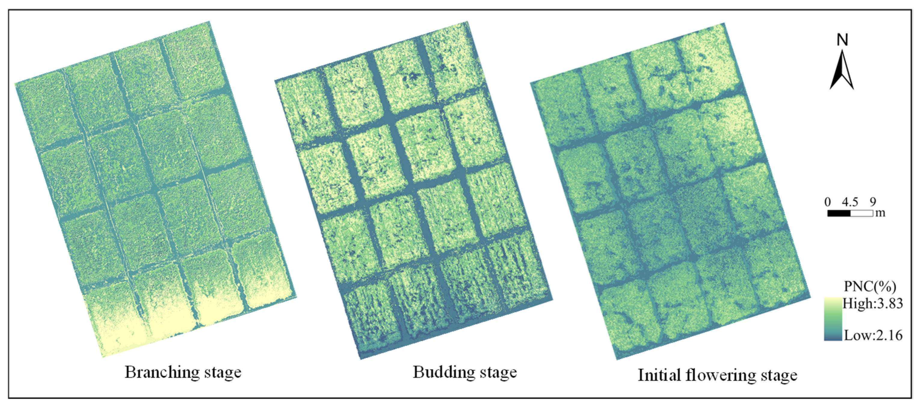 This study achieved the highest estimation accuracy using an XG-Boost model with integrated VIs + TIs as input features. Based on this approach, PNC was inverted for three growth stages of alfalfa, ultimately yielding the spatial distribution of PNC across each growth stage (Figure 9). Results indicate a gradual decline in PNC throughout the entire growth period, consistent with measured values. PNC ranged from 2.93% to 3.83% during the branching stage, from 2.17% to 3.13% during the budding stage, and from 2.16% to 3.11% during the initial flowering stage.