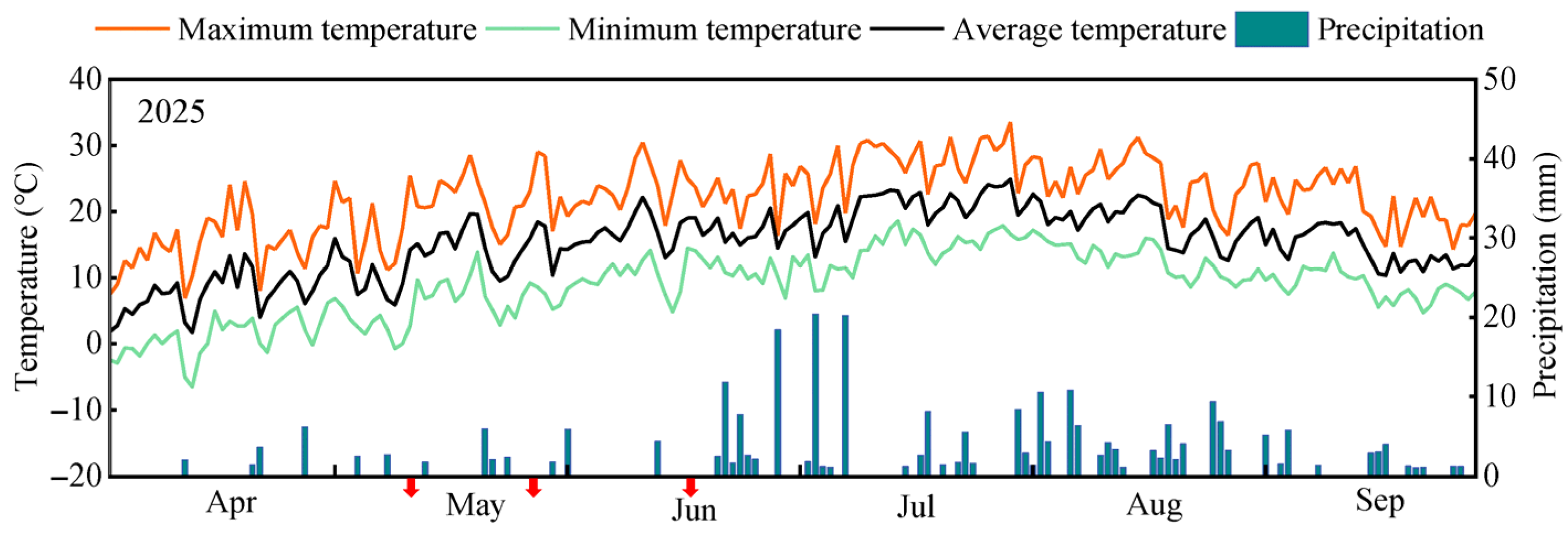 This experiment was conducted from April to October 2025 at the Jingtaichuan Electric Power Lift Irrigation Water Resources Utilization Center Irrigation Experiment Station in Gansu Province (37°12′59″ N, 104°05′10″ E, average elevation 1572 m, Figure 10). The primary soil type at the station is sandy loam, with physicochemical properties (Table 3). The region exhibits a temperate continental arid climate characterized by abundant sunlight and scarce precipitation. Annual average sunshine duration is 2652 h, with a frost-free period of 191 days. Radiation intensity reaches 6.18 × 105 J·cm−2, the average temperature is 8.6 °C, annual precipitation is 201.6 mm, and evaporation amounts to 2761 mm. Meteorological data (Figure 11) were monitored by a compact smart agricultural weather station (Davis) installed at the experimental station. The region’s climatic characteristics, including high temperatures, strong evaporation, and low precipitation, influence the migration and transformation processes of nitrogen in the field. While elevated temperatures promote nitrogen metabolism in alfalfa plants, they also exacerbate nitrogen volatilization losses. Concurrently, water stress inhibits soil nitrogen mineralization, further limiting nitrogen availability. Together, these factors constitute the environmental context for remote sensing estimation of plant nitrogen content (PNC) in alfalfa within this study.