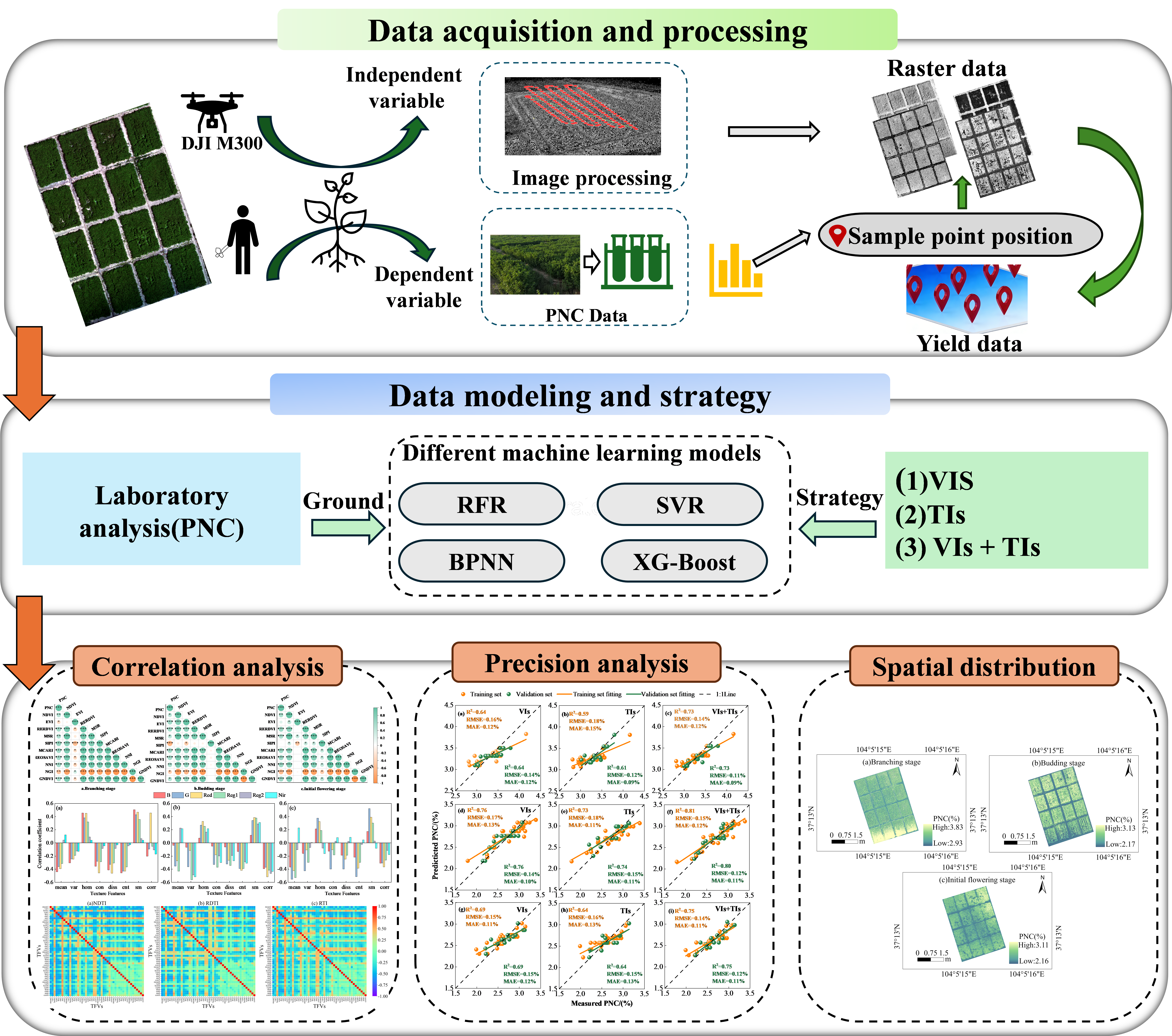 Data organization in this study was carried out using Microsoft Excel 2019. Preprocessing of drone multispectral imagery was conducted using Pix4D Mapper 4.8.0 and ENVI 5.6 software to extract canopy mean reflectance and TFVs, subsequently calculating vegetation indices (VIs) and texture indices (TIs). Using ArcGIS Pro 3.1.6, we extracted datasets for each sample point based on the vector boundaries of the experimental plots. We performed Pearson correlation analysis using Python 2024.3.5 programs and built and tested models based on the sklearn library. Plots were generated using Origin 2021 software.