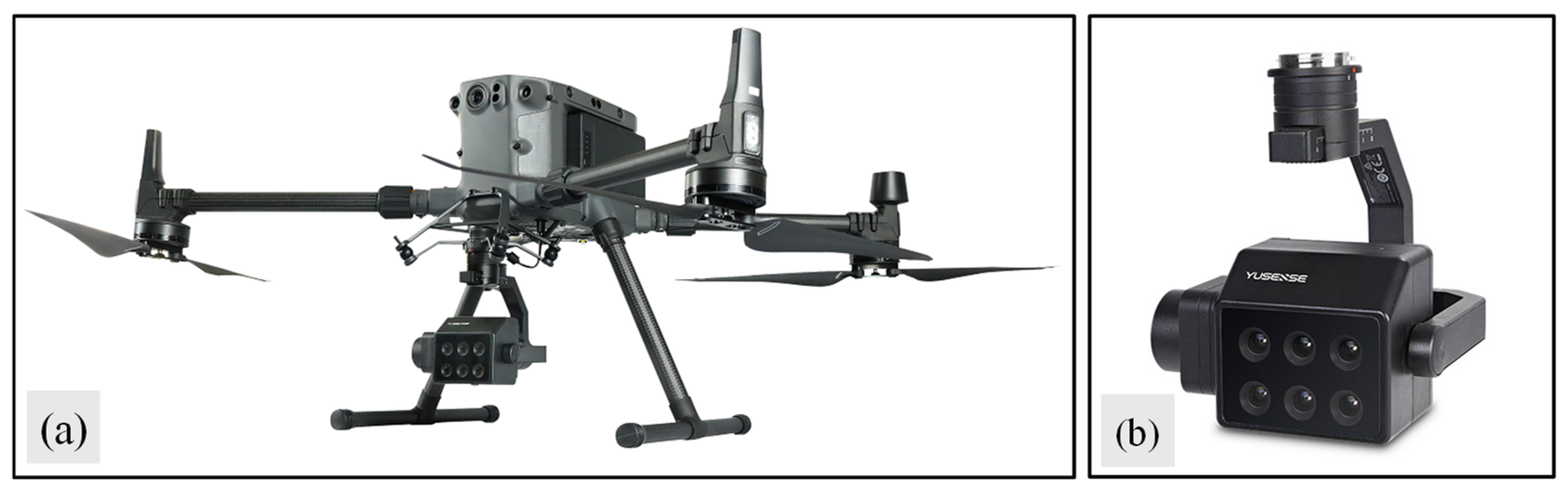 All remote sensing data collection in this experiment was conducted under clear, windless conditions with ample sunlight. Data acquisition occurred during the branching stage (10 May 2025), budding stage (24 May 2025), and initial flowering stage (15 June 2025); a DJI Matrice 300 RTK quadcopter drone (DJI Technology Co., Ltd., Shenzhen, China) (Figure 13a) equipped with an MS 600 Pro multispectral camera (Changguang Yuchen Information Technology Equipment Co., Ltd., Qingdao, China) (Figure 13b) was utilized. Prior to data collection, radiometric calibration was performed using a standardized white reference panel to compensate for variations in lighting conditions. Each flight followed a predetermined route, with the drone operating at a speed of 2.7 m/s at an altitude of 30 m. The heading overlap rate was 80%, the side overlap rate was 70%, and the flight duration was from 12:00 to 13:00. The multispectral camera was oriented vertically downward. The center wavelengths, bandwidths, and reflectance of the diffuse reflector (Table 4) yielded a ground resolution of 2.16 cm.
