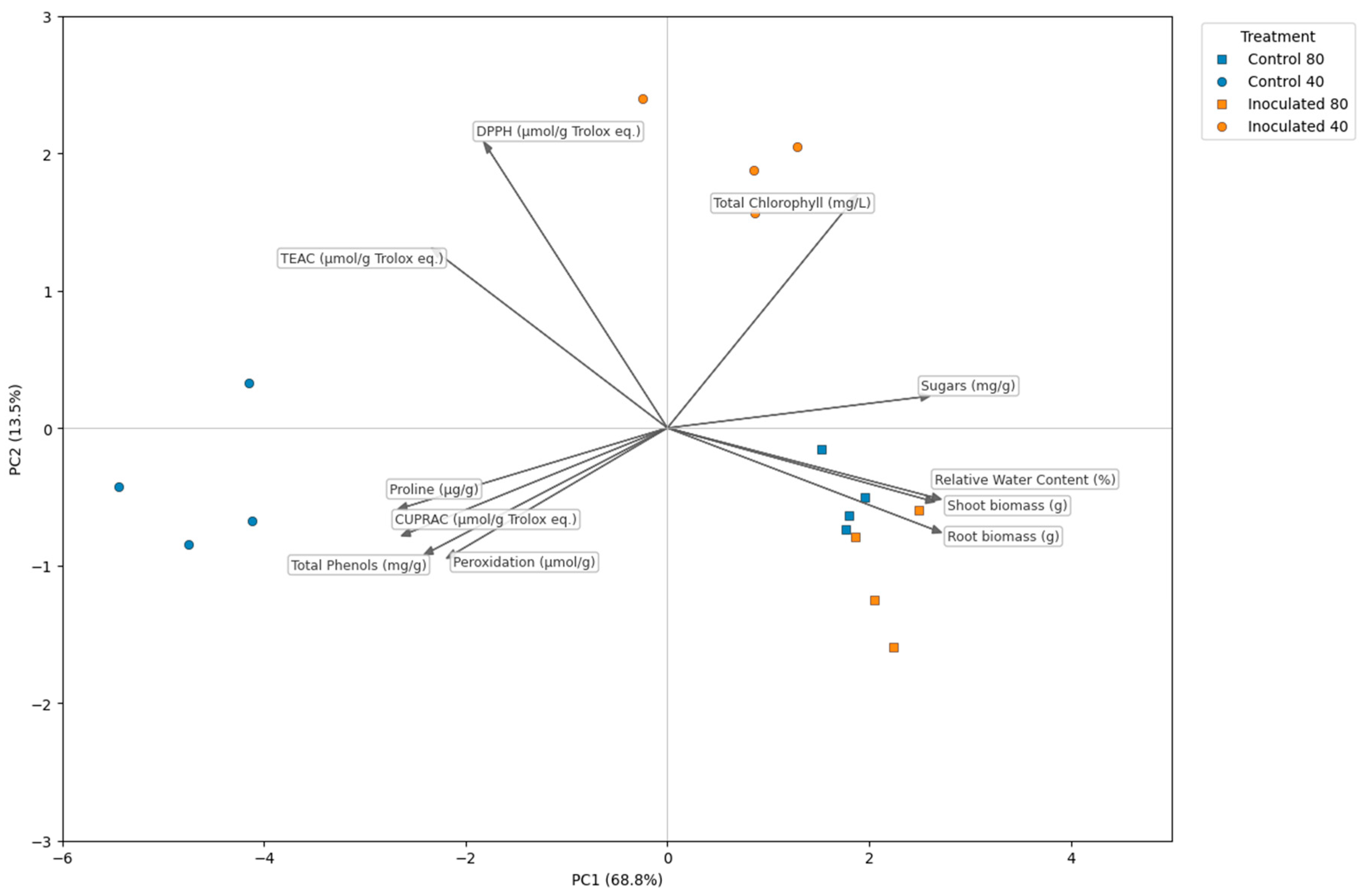 | Treatment | Total Chlorophyll Content (mg L−1) | Relative Water Content (%) | Total Sugars (mg g−1 Sample) |