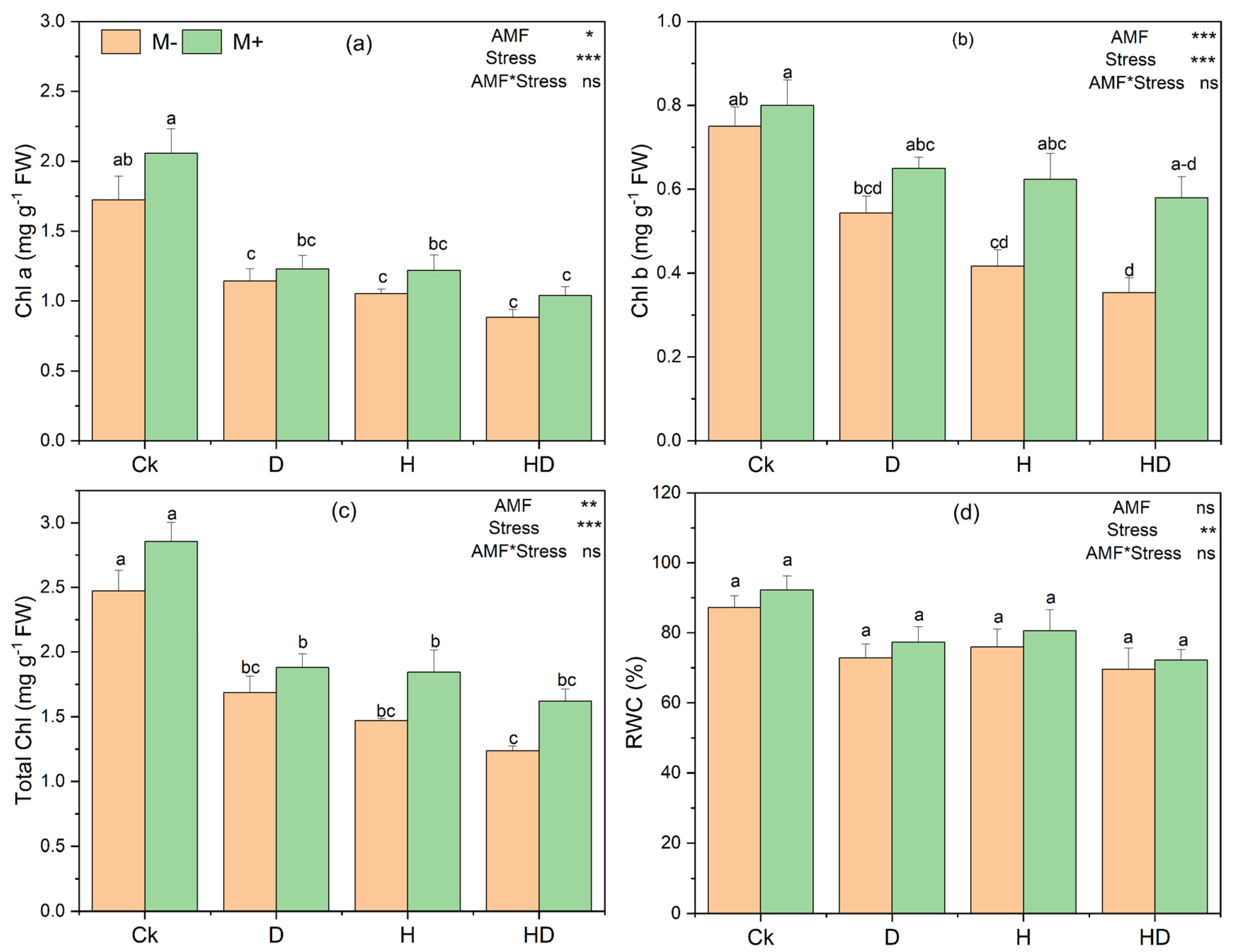 2.2. Experiment 2: Effects of AMF on Drought and Heat Stress