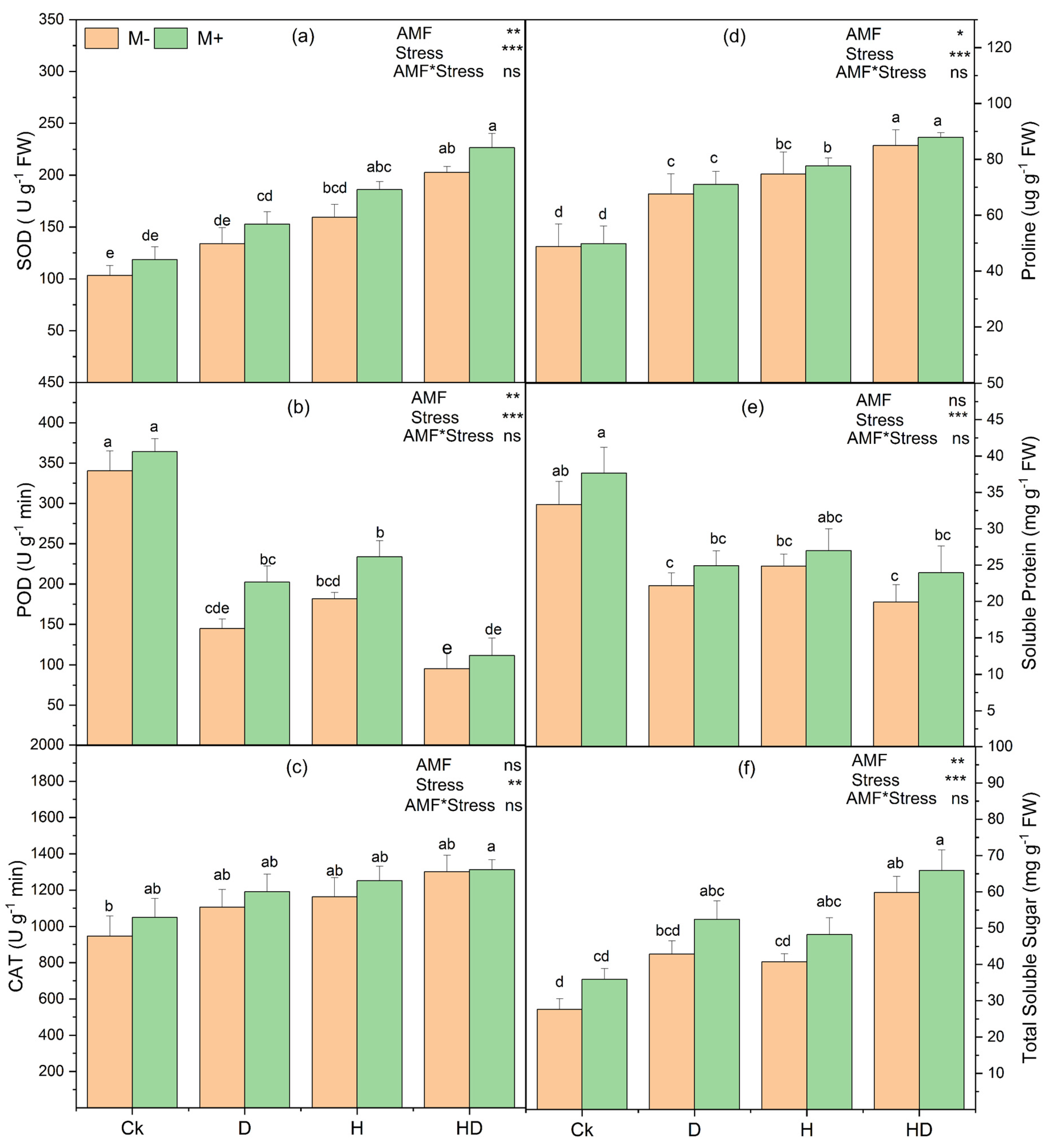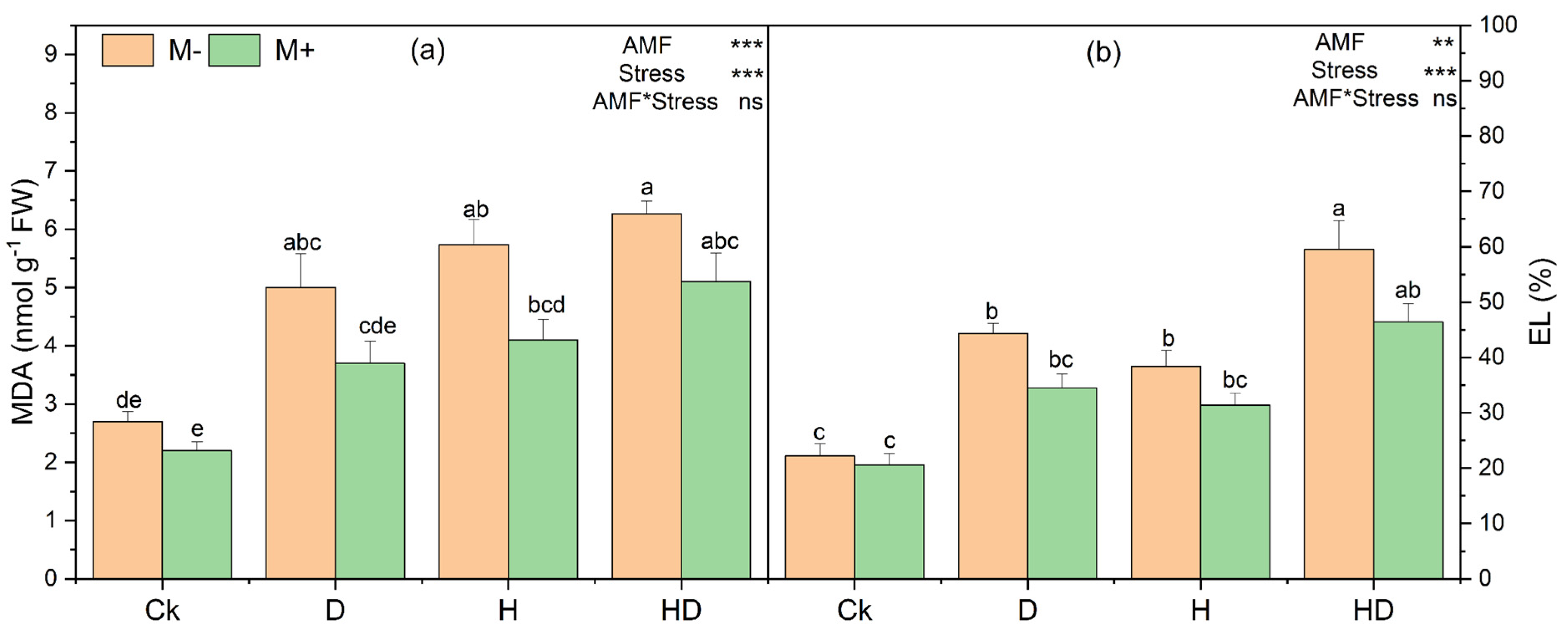 3.10. Effects of Arbuscular Mycorrhizal Fungi (AMF) on Lipid Peroxidation and Membrane Damage of Taiwan Lily Under Drought and Heat Stress