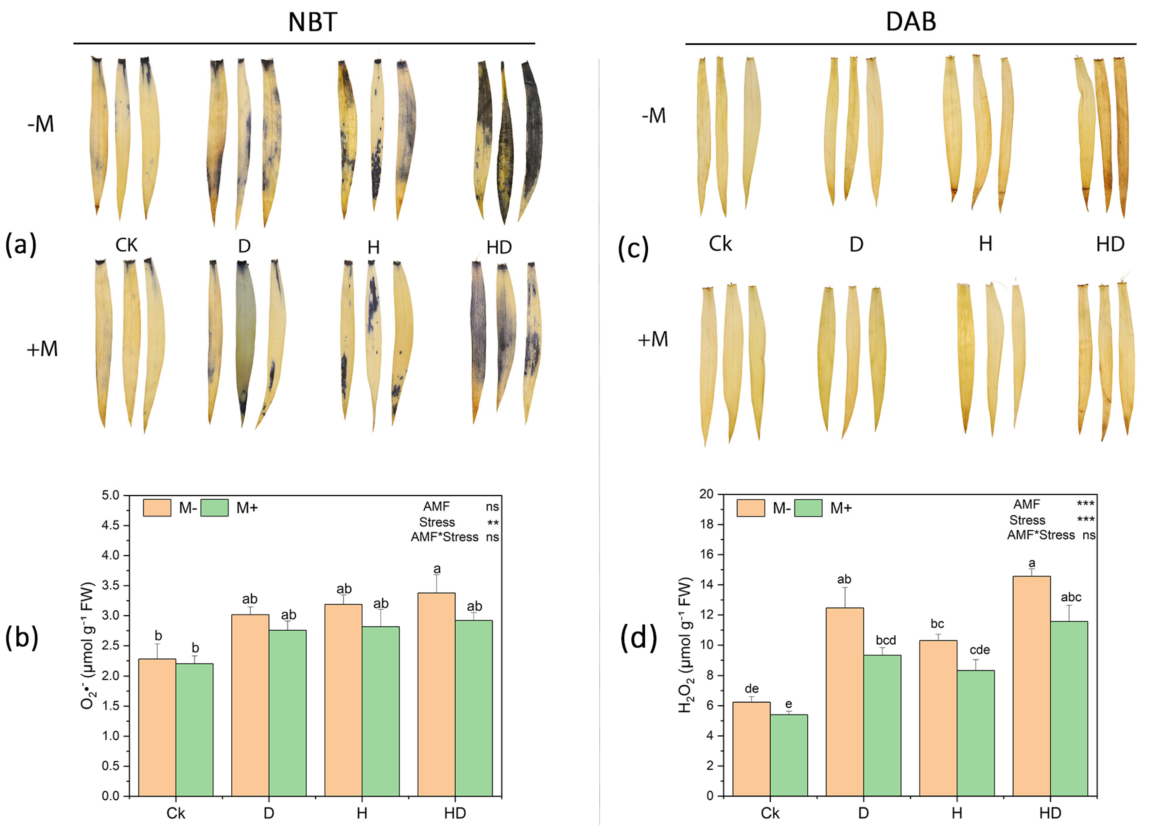 3.11. Effects of Arbuscular Mycorrhizal Fungi (AMF) on Reactive Oxygen Species (ROS) Accumulation in Taiwan Lily Under Drought and Heat Stress