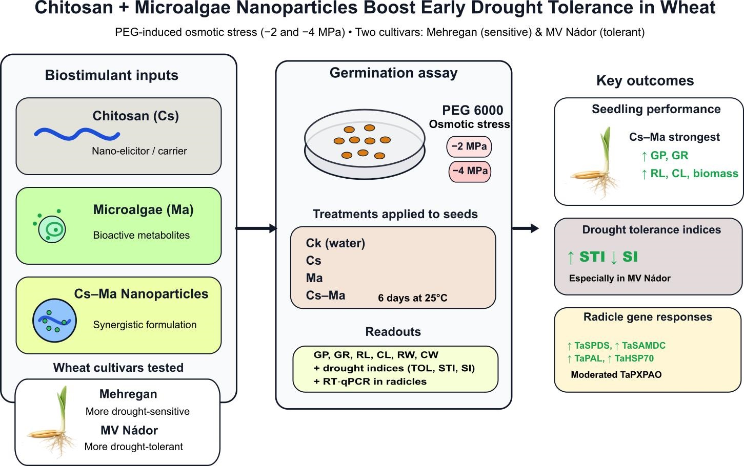 APA StyleGholizadeh, F., Silva, A. G. S. D. D., Samuel, A., Molnár, Z., & Janda, T. (2026). Chitosan and Microalgae Nanoparticles: Synergistic Role in Enhancing Drought Stress Tolerance in Wheat Seedlings. Plants, 15(5), 792. https://doi.org/10.3390/plants15050792