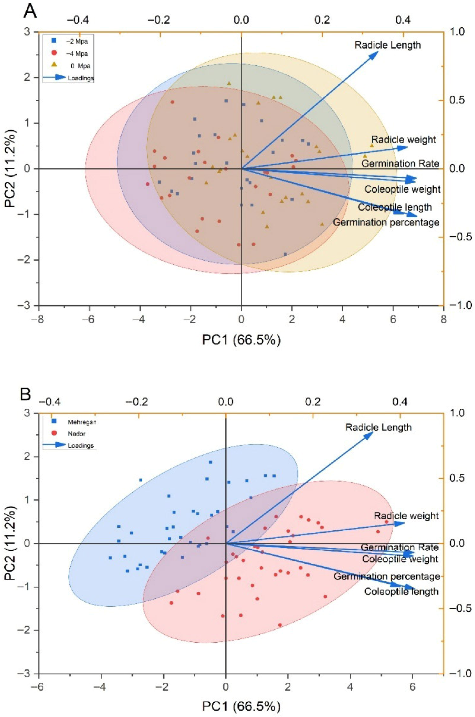 - Ahmed, K.; Shabbir, G.; Ahmed, M. Exploring drought tolerance for germination traits of diverse wheat genotypes at seedling stage: A multivariate analysis approach. BMC Plant Biol. 2025, 25, 390. [Google Scholar] [CrossRef]