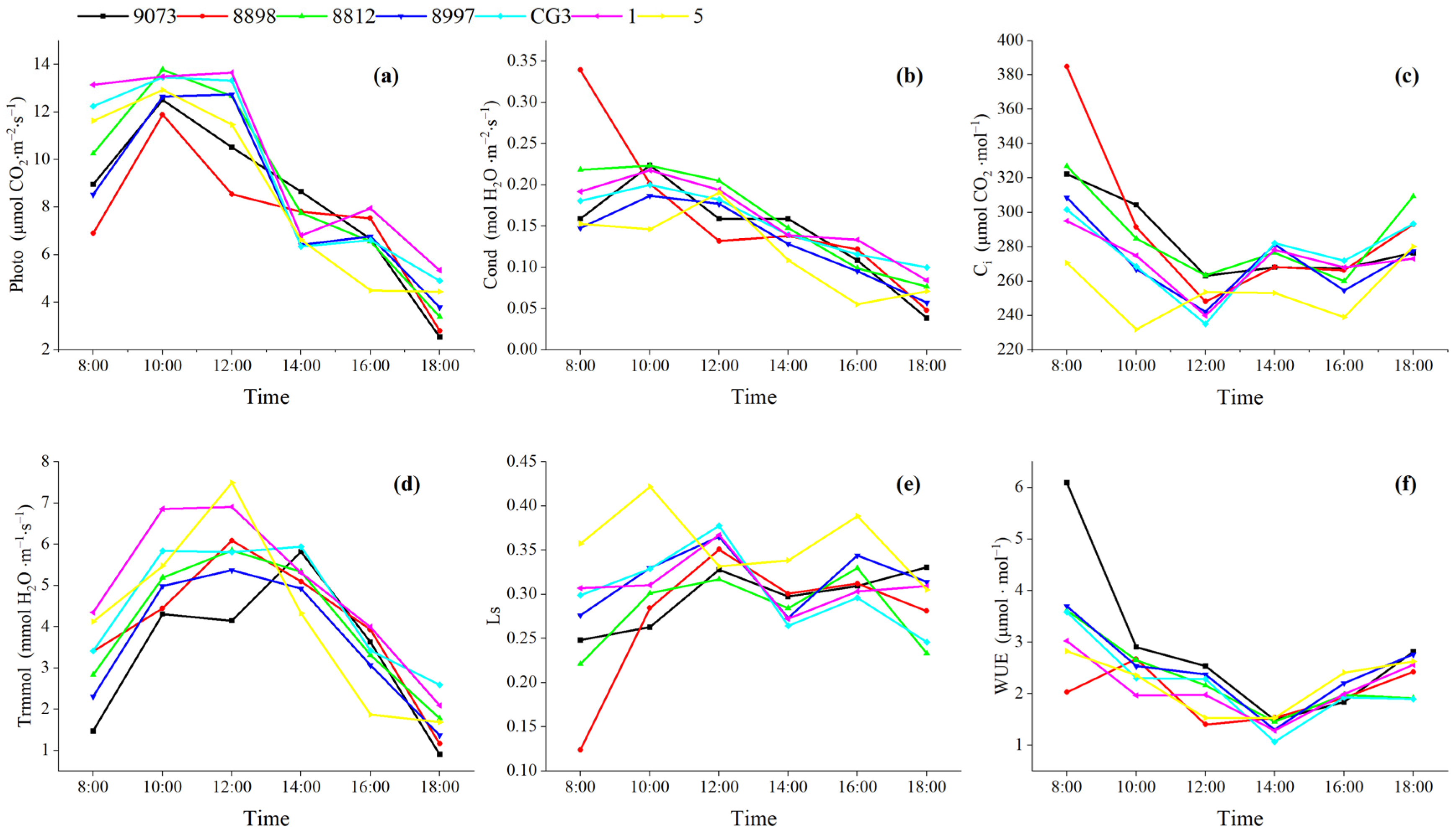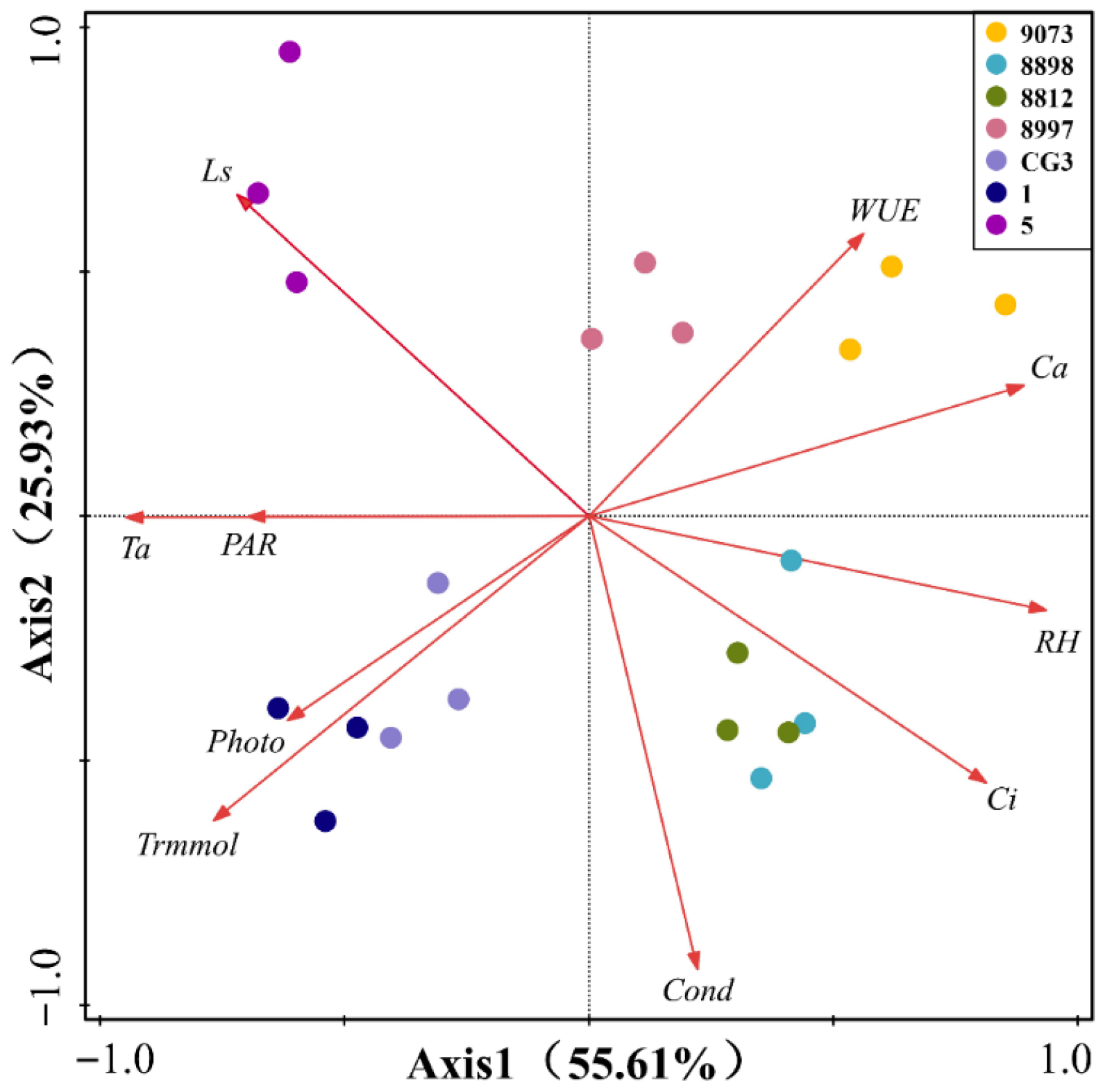 | Parameter | Cond | Ci | Trmmol | WUE | Ls | Ta | Ca | RH | PAR |