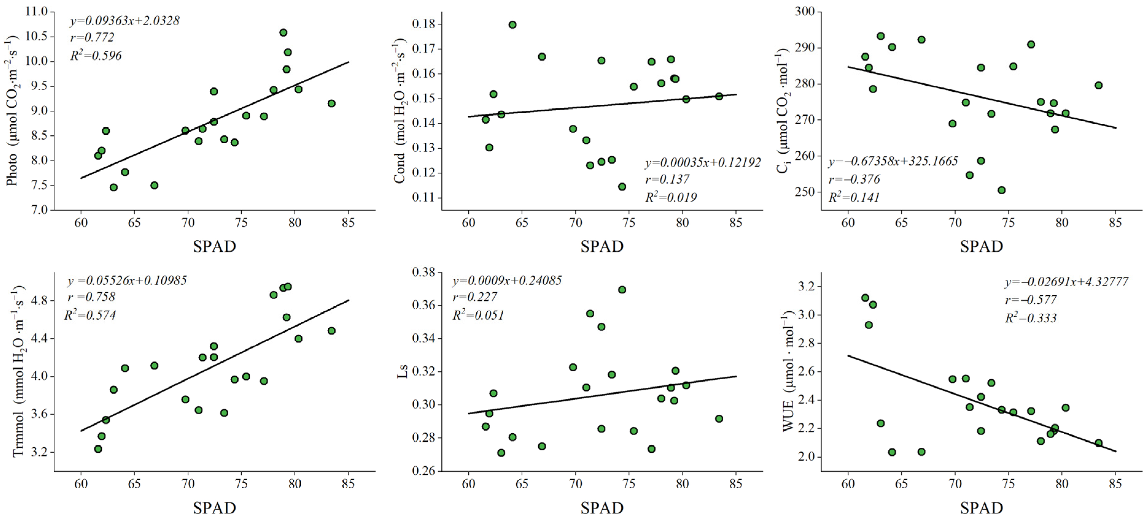 2.6. Linear Fitting of Photosynthetic Indices to Chlorophyll Content
