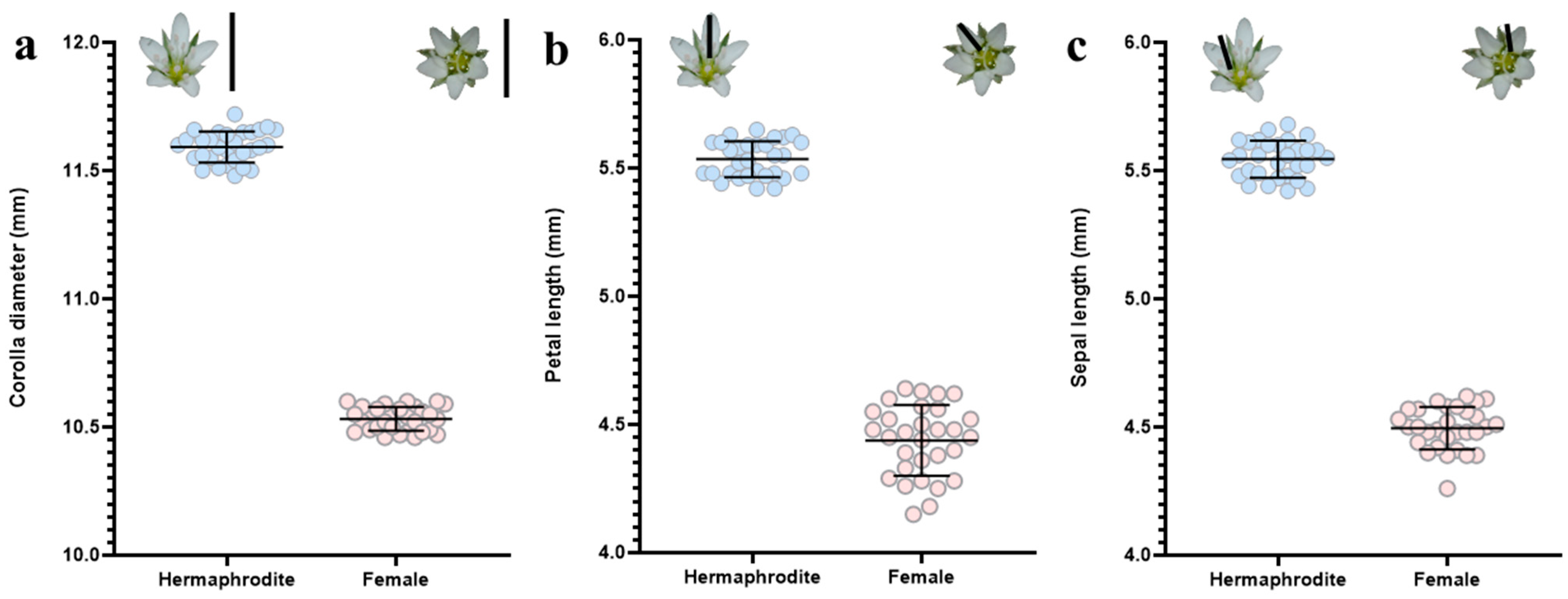 - Gavini, S.S. Sexual dimorphism and female advantage hypothesis in the gynomonoecious-gynodioecious Dianthus plumarius (Caryophyllaceae). AoB Plants 2023, 15, plad084. [Google Scholar] [CrossRef]