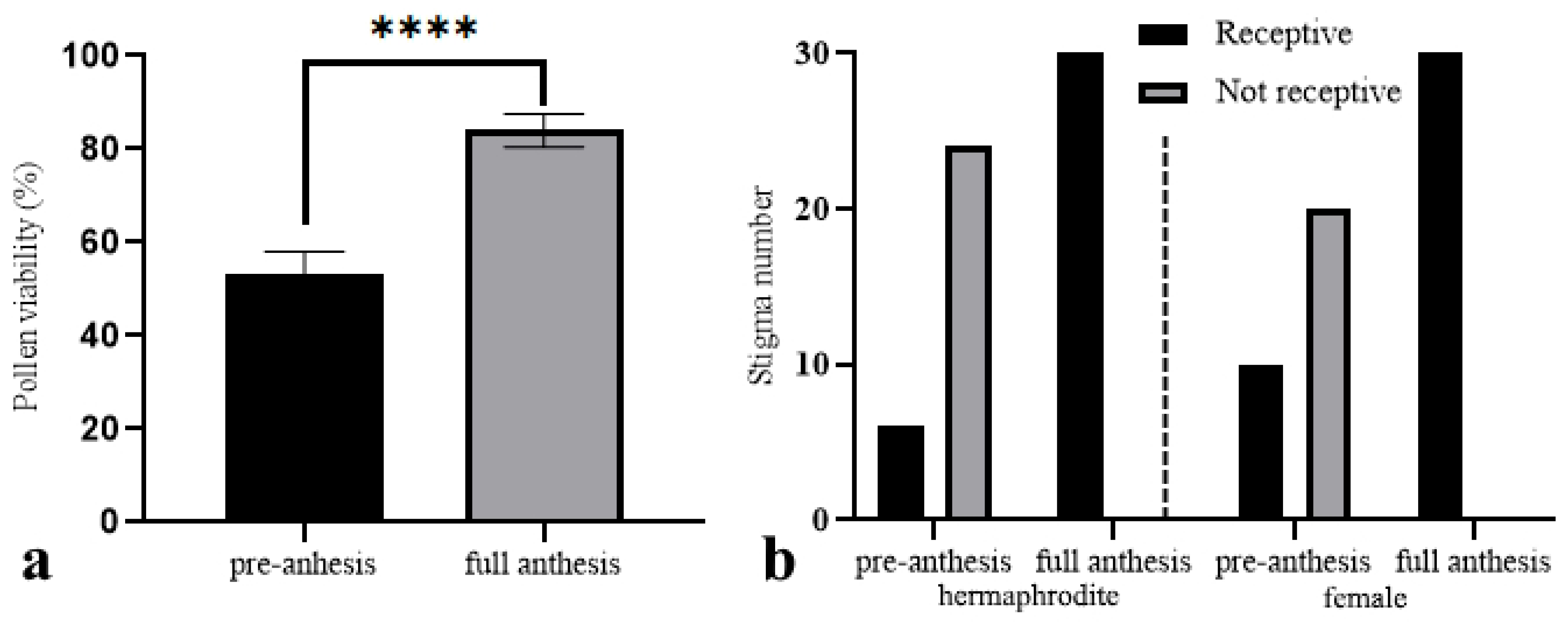 4.6. Determination of Pollen:Ovule Ratio and Self-Incompatibility in Hermaphrodites