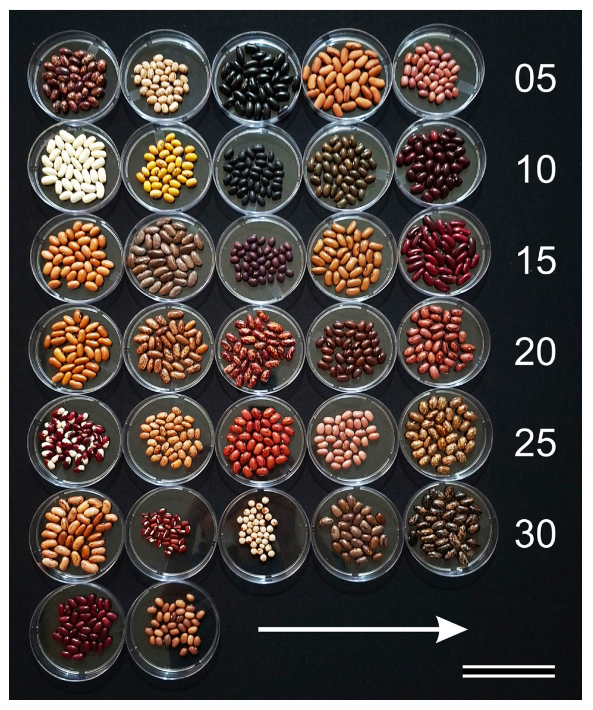 The selected landraces represent a broad spectrum of traditional bean types in Brazil, encompassing substantial phenotypic, biochemical and genetic diversity preserved through long-term farmer selection and regional adaptation processes. The collection comprised the following cultivars: (1) Feijão Amendoim Roxo, (2) Feijão Carioca, (3) Feijão Preto Gigante, (4) Feijão Branco Manteiga, (5) Feijão Rosinha, (6) Feijão Branco Gigante, (7) Feijão Canário, (8) Feijão Preto Mocotó, (9) Feijão Verde, (10) Feijão Vermelho Bolinha, (11) Feijão Branco Bolinha, (12) Feijão Mouro Gigante, (13) Feijão Roxinho, (14) Feijão Creme, (15) Feijão Vermelho Gigante, (16) Feijão Jalo, (17) Feijão Amendoim Bege, (18) Feijão Boreal Rosa, (19) Feijão Chocolate, (20) Feijão Amendoim Rosa, (21) Feijão Olho de Pombo, (22) Feijão Bico de Ouro, (23) Feijão Amendoim, (24) Feijão Ovo de Tito-Tico, (25) Feijão Amendoim Verde, (26) Feijão Rajado, (27) Feijão Azaki, (28) Feijão Guandu, (29) Feijão Mouro, (30) Feijão Mancá, (31) Feijão Vermelho and (32) Feijão Rapa Cuiua (