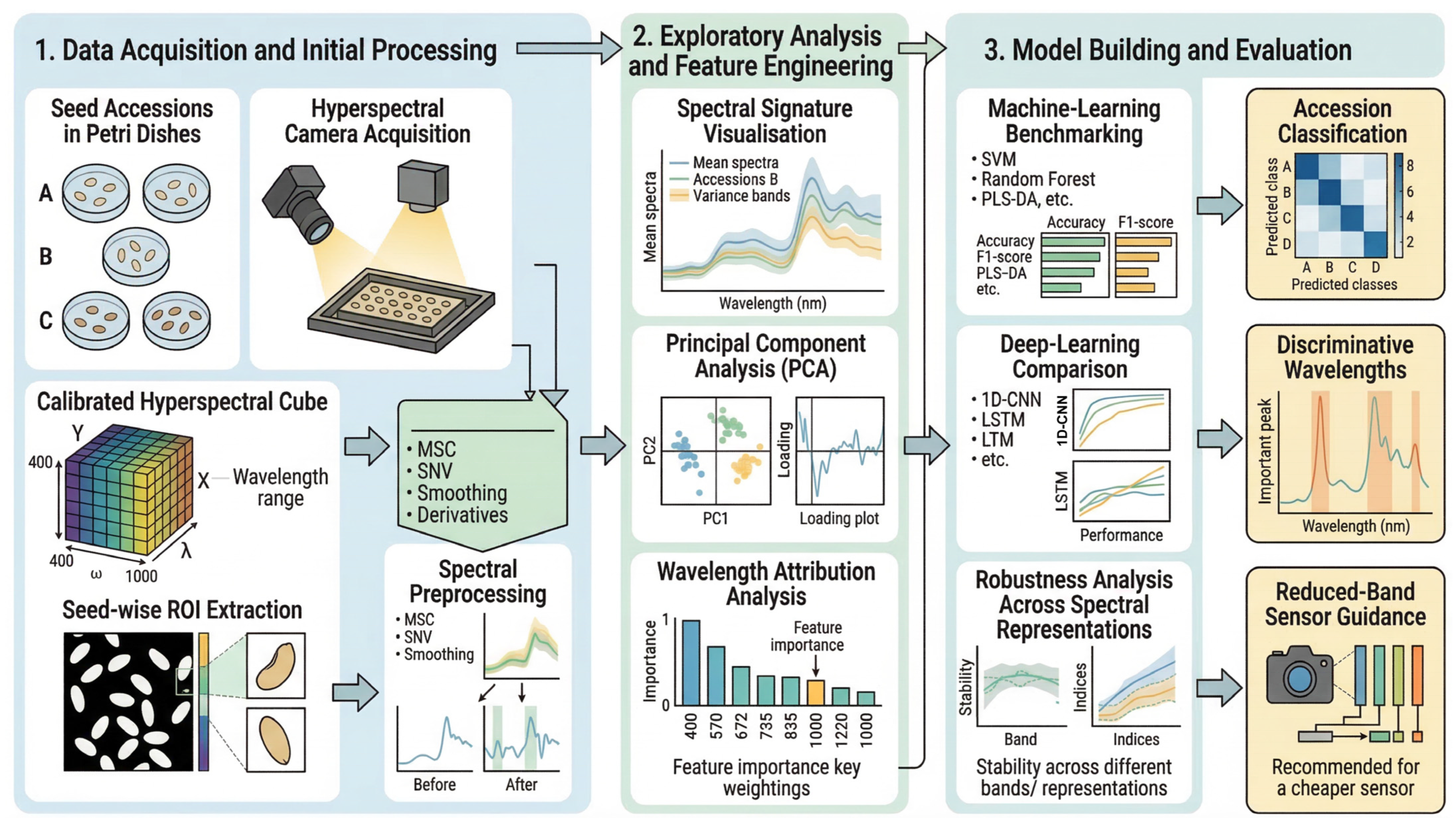 We hypothesise that accession separability is predominantly low-dimensional and concentrated within contiguous spectral windows. This would enable band-reduced representations compatible with lower-cost sensors. A further hypothesis is that, in the moderate-data regime typical of curated germplasm screening, relatively simple one-dimensional deep models are more reliable than more elaborate sequence architectures because their inductive biases better match the signal-to-sample ratio. We test these hypotheses by combining wavelength-resolved association analysis and supervised band prioritisation with systematic benchmarking of classical and deep learners, alongside explicit computational profiling, to translate statistical performance into practical feasibility for conservation, traceability and scalable agricultural sensing. Any translational implication for lower-cost sensing is therefore treated here as provisional and subject to explicit external validation.