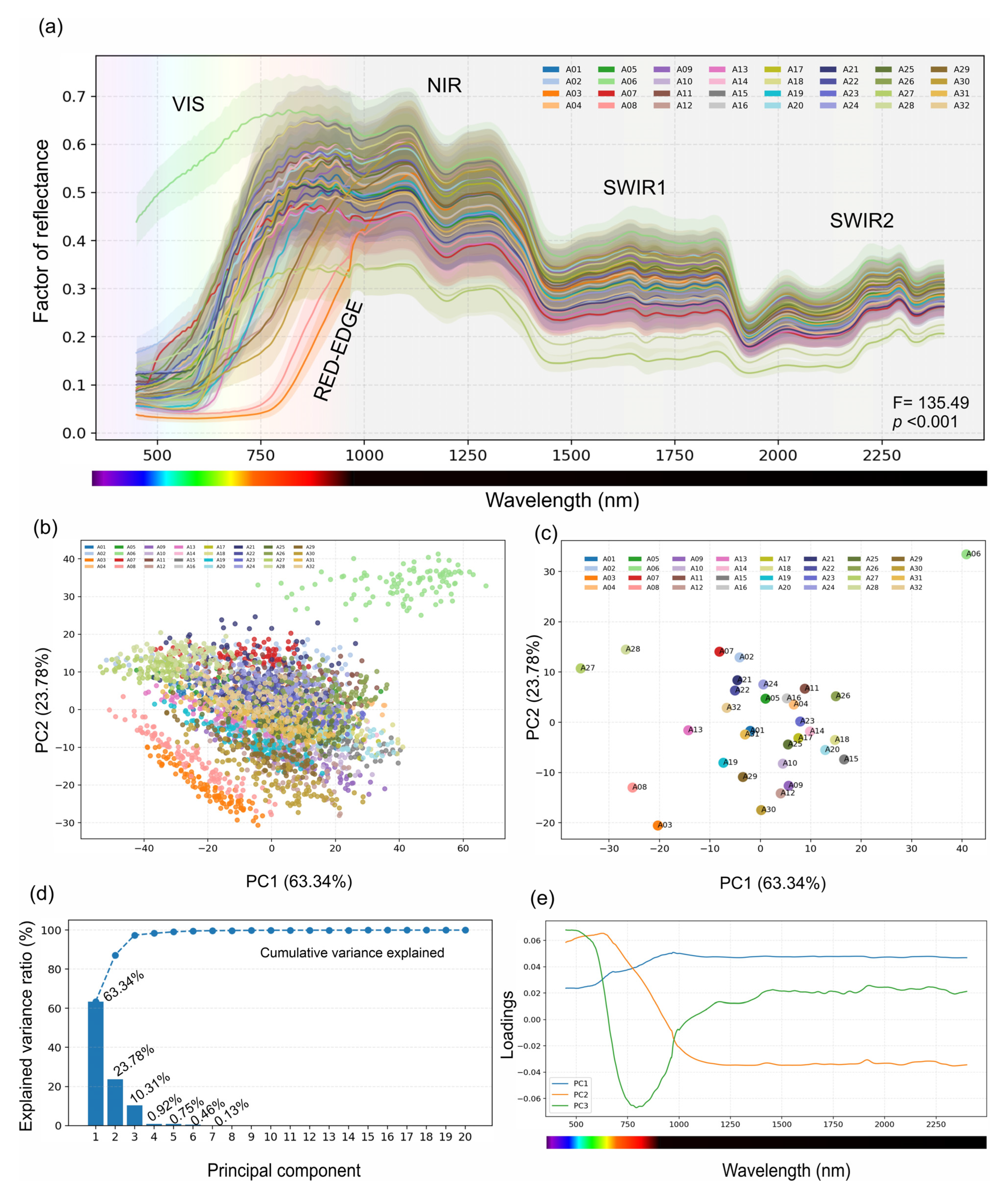 Each extracted ROI was represented by a single reflectance vector comprising P = 563 bands spanning 449.54–2399.17 nm. Accessions were indexed via codes A01–A32, corresponding directly to the cultivar numbering defined in