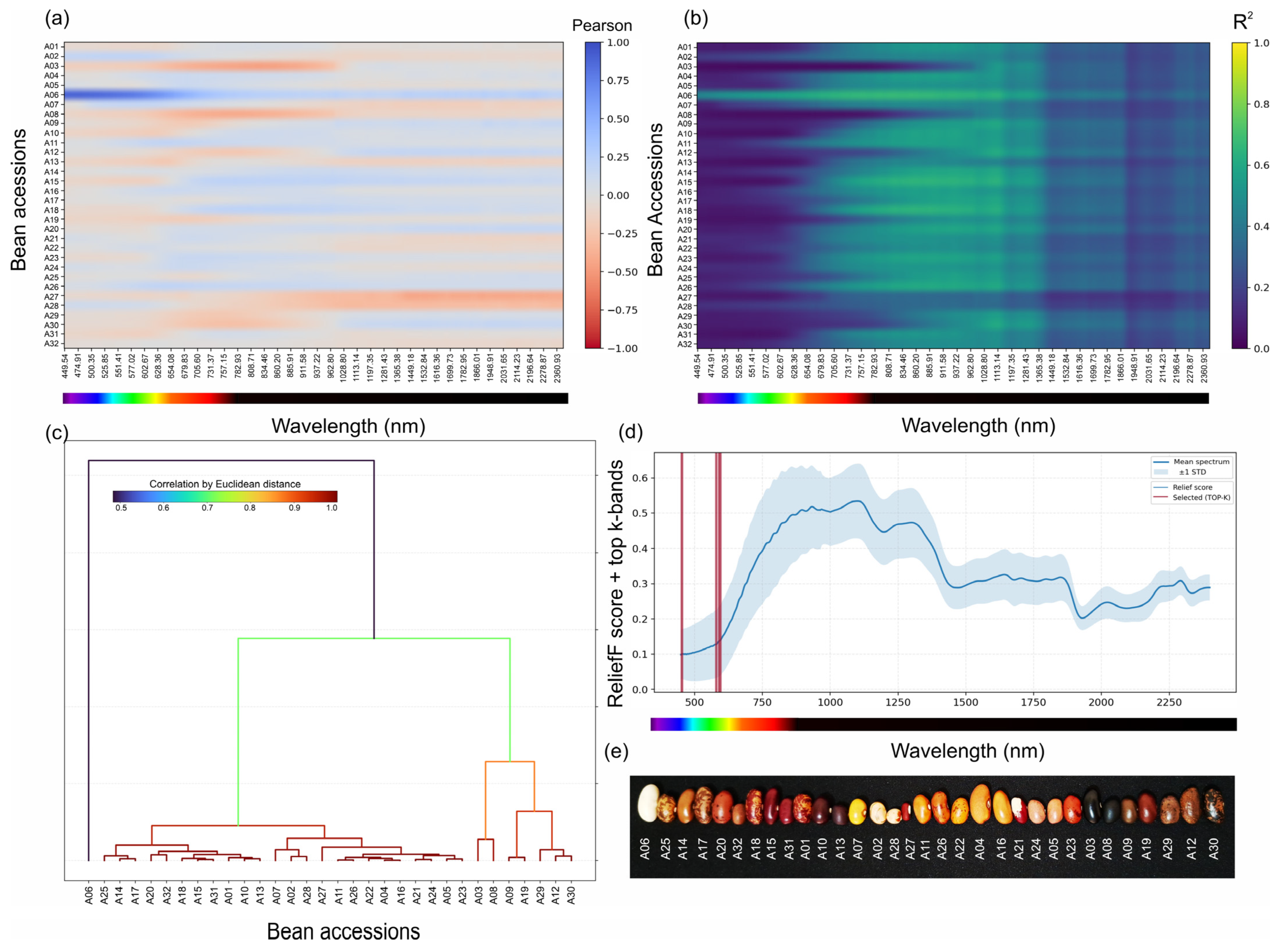 For presentation, correlation maps retained the sign of r, whereas attribution strength was summarised as the coefficient of determination (R2). This dual representation allowed the direction of association and its magnitude to be visualised separately across the spectrum. Hierarchical clustering was applied to the accession-mean spectra using Euclidean distance and average linkage to describe spectral similarity at the accession level. Representative seed images were then arranged in dendrogram leaf order to facilitate visual comparison between spectral neighbourhoods and seed coat phenotypes.
