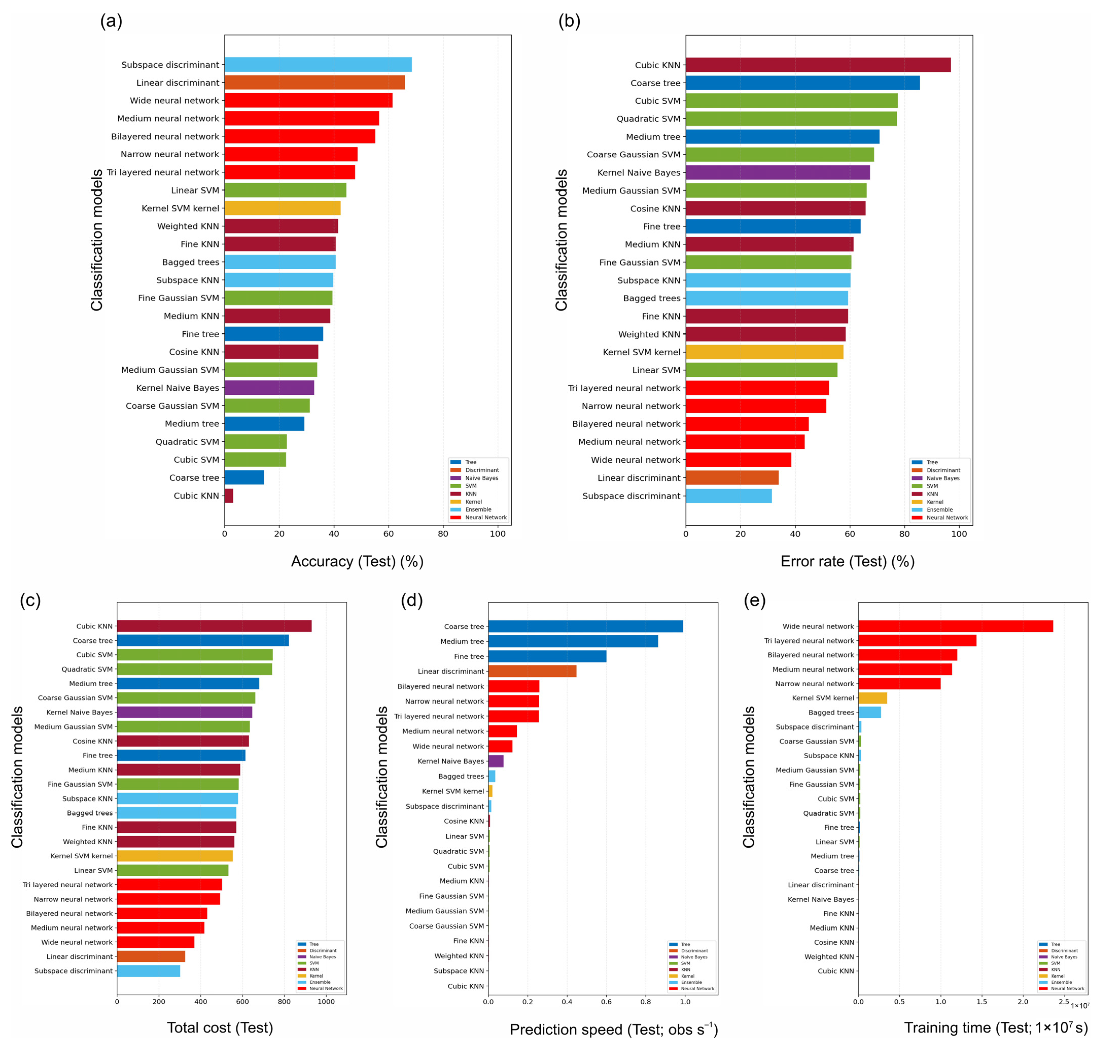 Within the classical suite, the full-spectrum benchmark was dominated by linear discriminant analysis and linear SVM, indicating that much of the accession structure becomes close to linearly separable once the full 563-band reflectance profile is retained. Across the reduced-band benchmarks, the subspace discriminant was the strongest classifier, but the performance fell well below the full-spectrum setting—especially after edge-band trimming. This contrast suggests that a broad spectral context contributes more to class boundary stability than a compact top-k ranking alone can preserve.