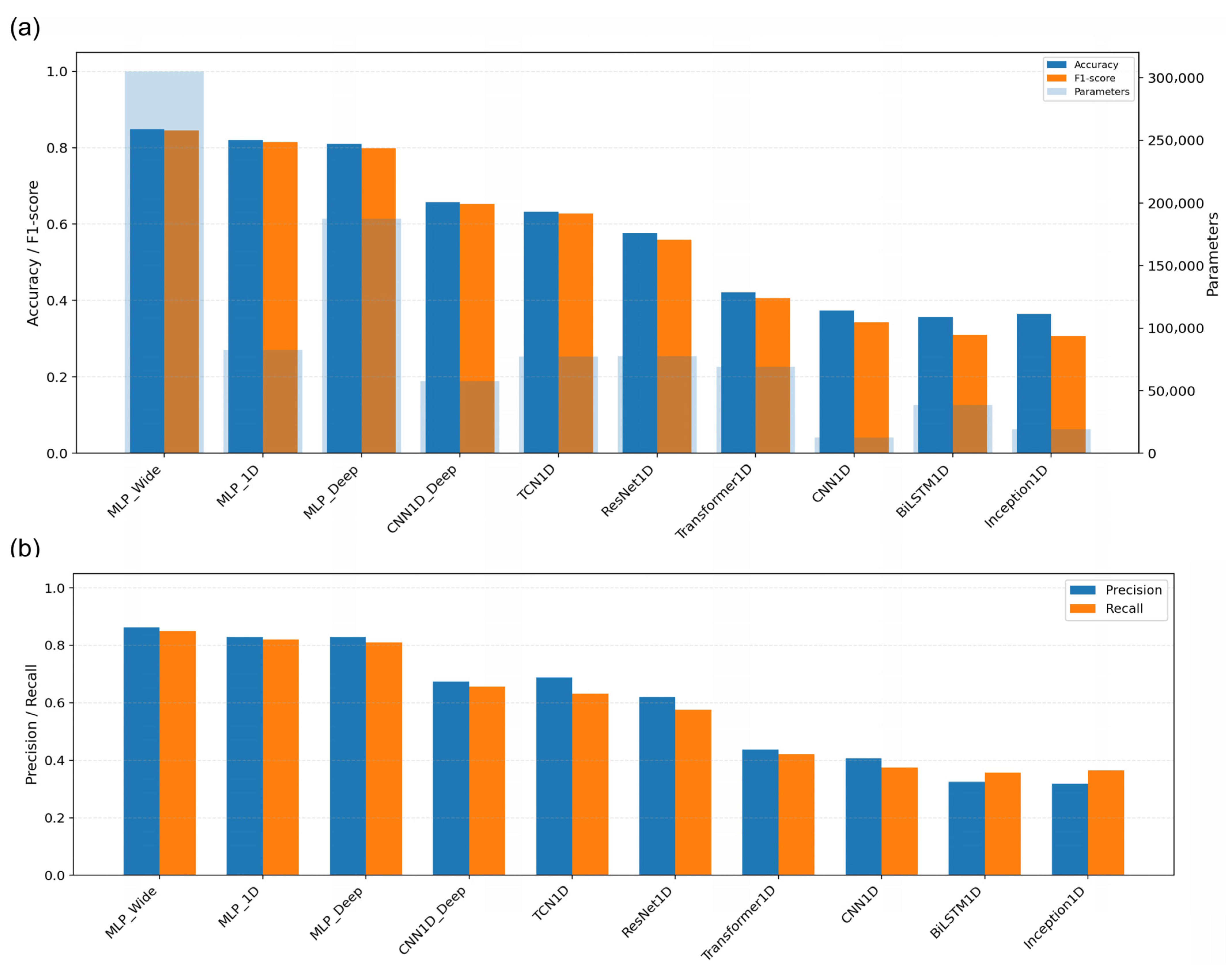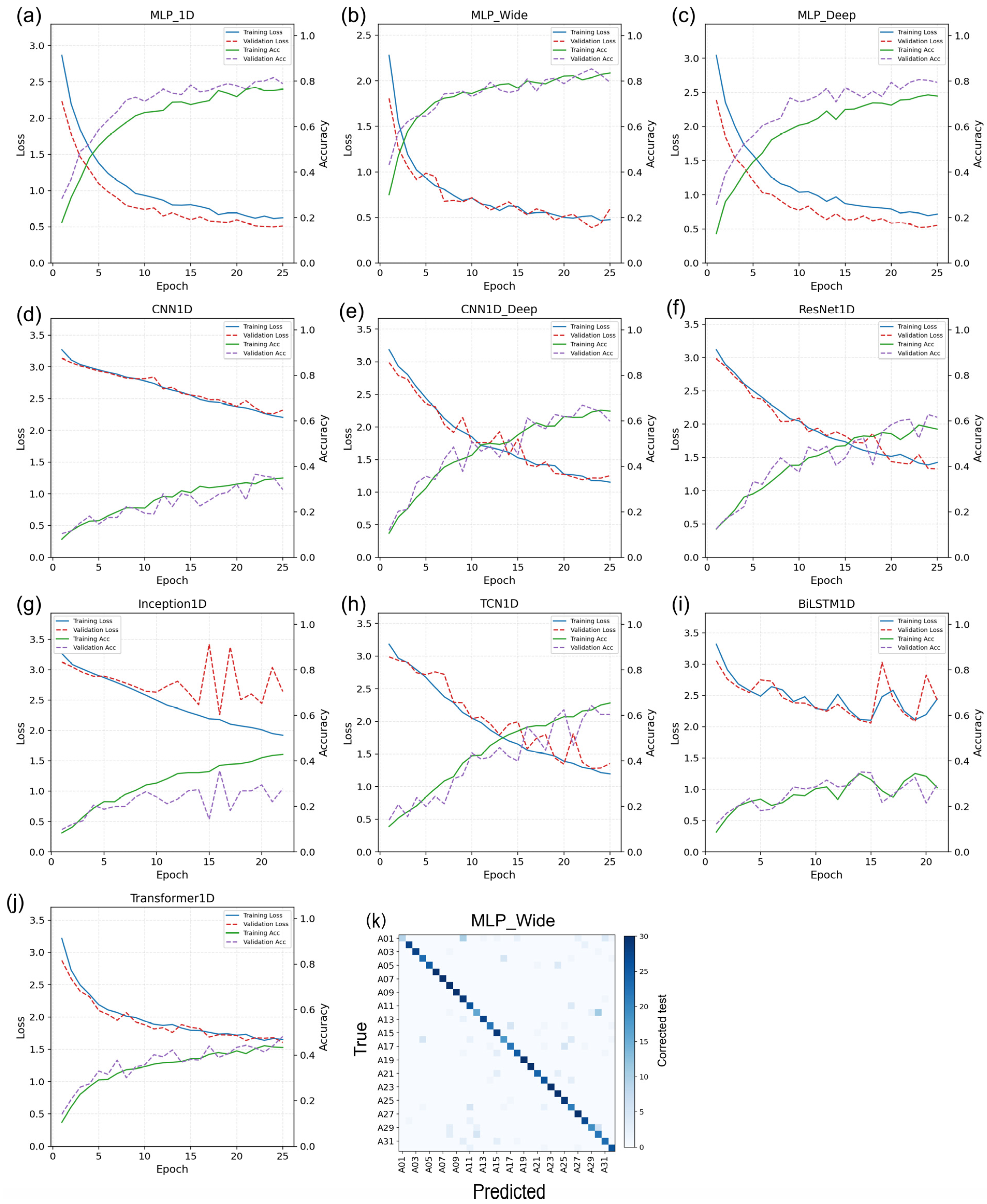 The evaluated architectures included three multilayer perceptrons (MLP_1D, MLP_Wide and MLP_Deep), two one-dimensional convolutional neural networks (CNN1D and CNN1D_Deep), ResNet1D, Inception1D, TCN1D, BiLSTM1D and Transformer1D. All the models were trained with the Adam optimiser (learning rate = 1 × 10−3), a batch size = 32 and a maximum of 25 epochs; early stopping (patience = 6) restored the weights associated with the lowest validation loss.