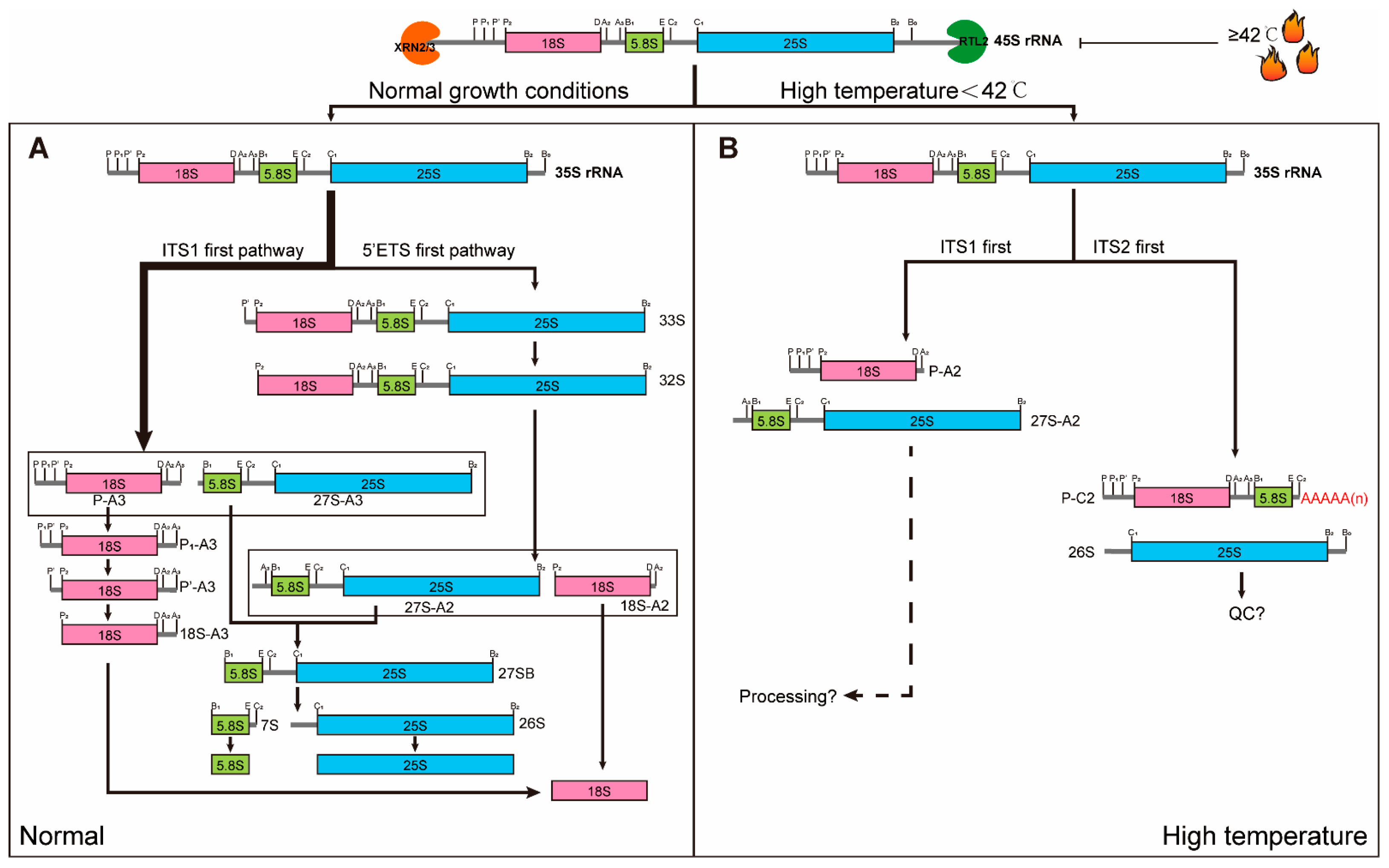 - Darriere, T.; Jobet, E.; Zavala, D.; Escande, M.L.; Durut, N.; Bures, A.; Blanco, F.; Vidal, E.A.; Rompais, M.; Carapito, C.; et al. Upon Heat Stress Processing of Ribosomal RNA Precursors into Mature rRNAs Is Compromised after Cleavage at Primary P Site in Arabidopsis thaliana. RNA Biol. 2022, 19, 719–734. [Google Scholar] [CrossRef]