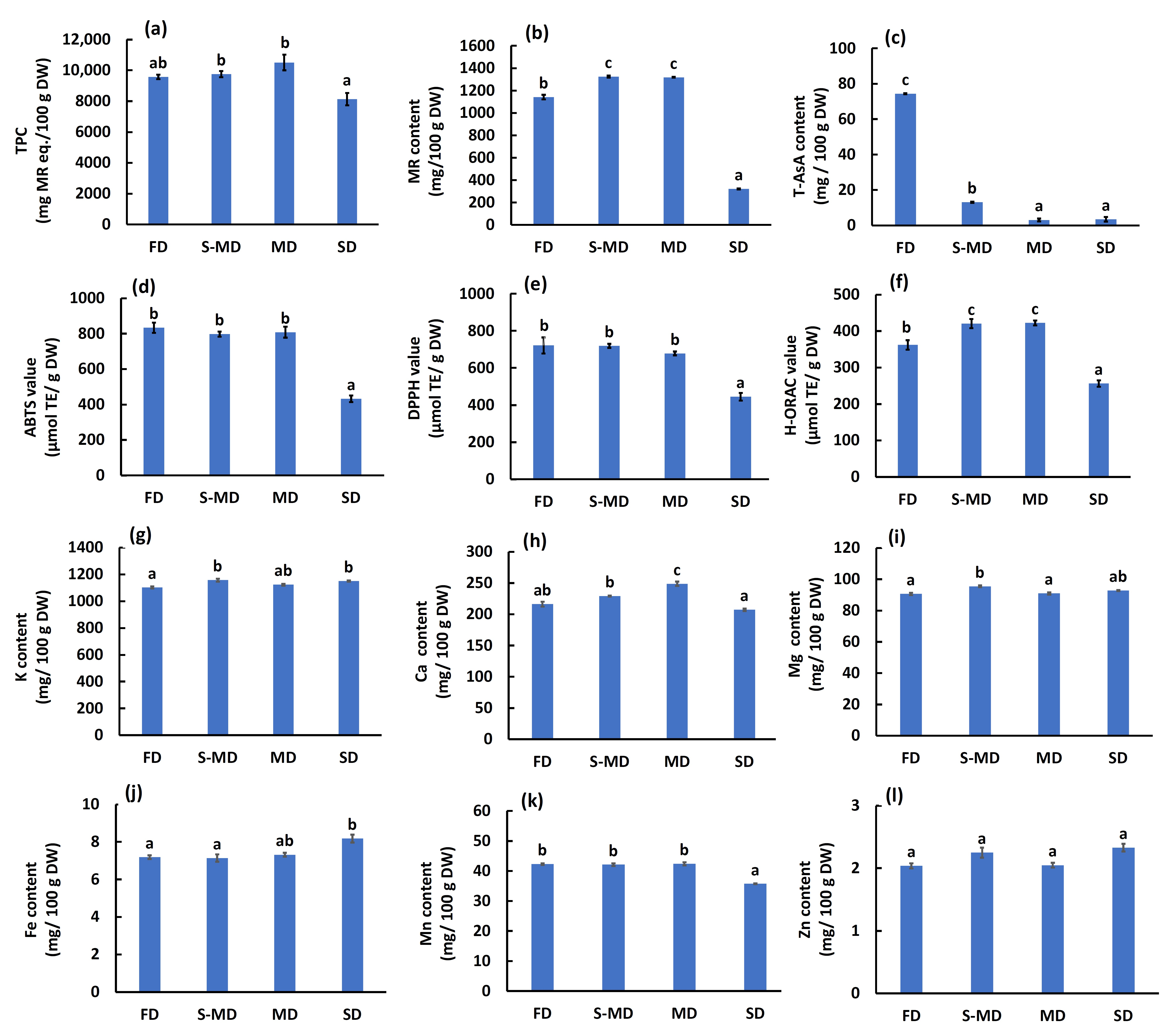 2.7. Effect of Drying Methods on Chemical Composition, Antioxidant Activities, and Mineral Content