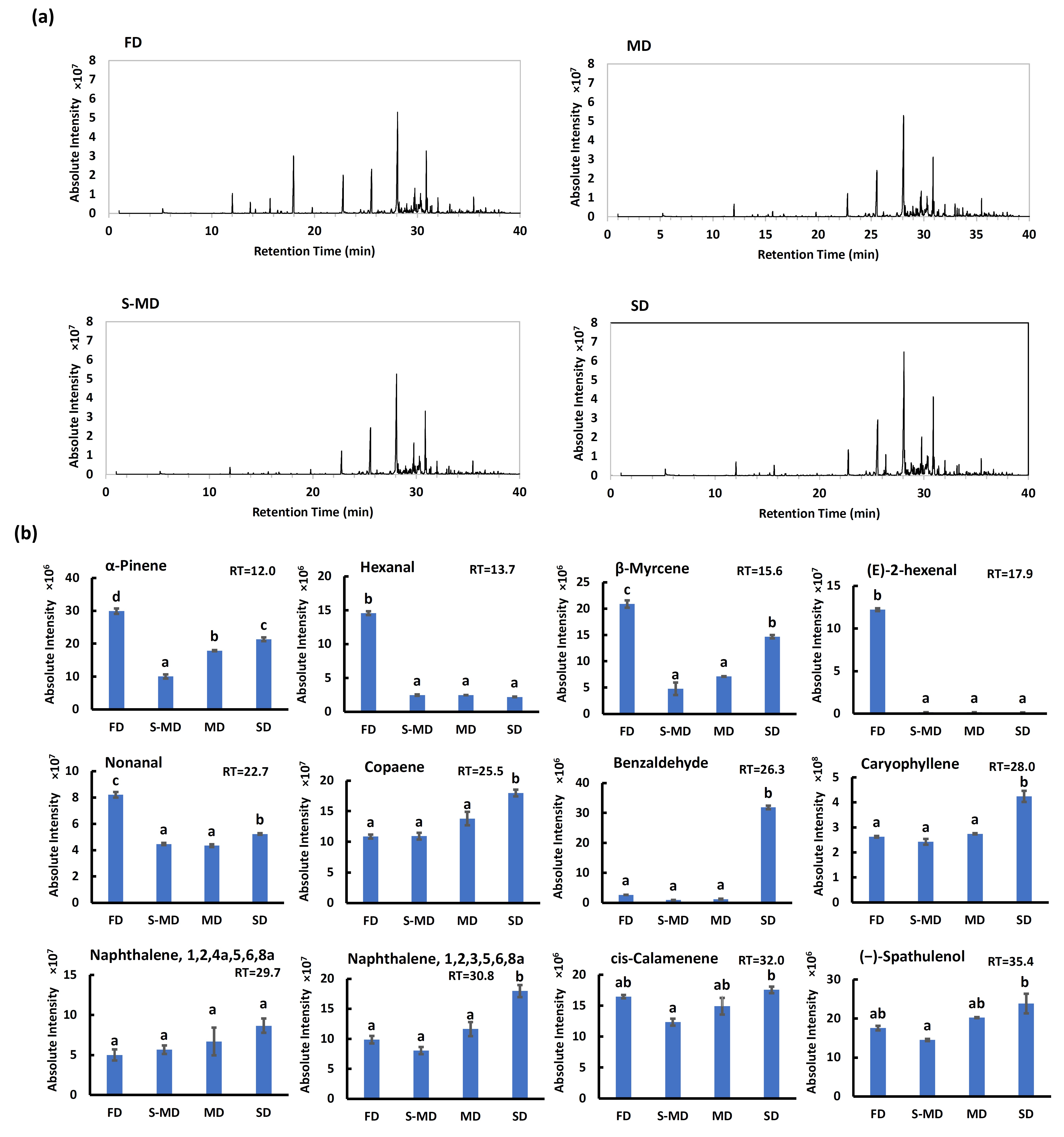 2.8. Effect of Drying Methods on Volatile Profiles