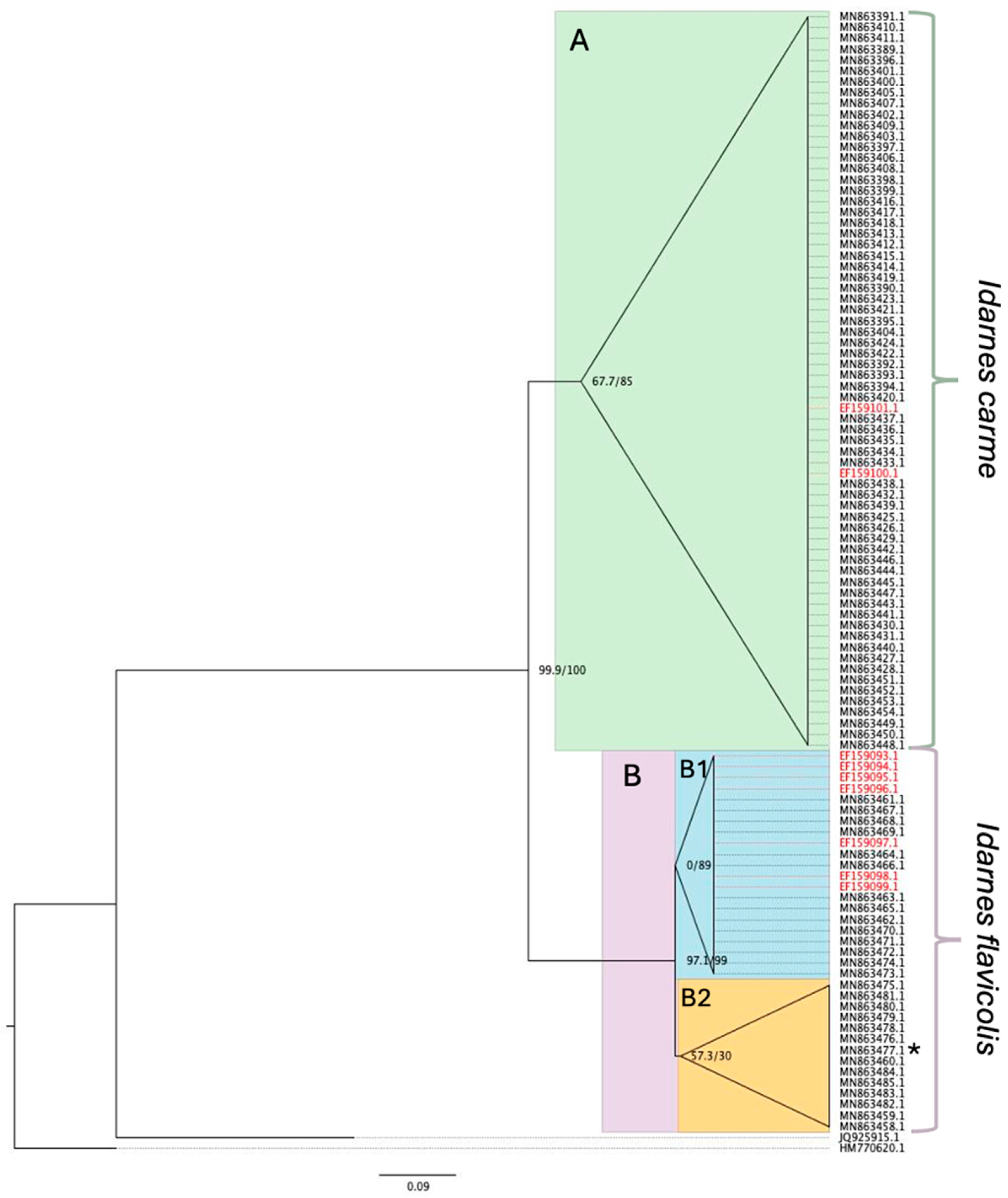 - Elias, L.G.; Teixeira, S.D.P.; Kjellberg, F.; Pereira, R.A.S. Diversification in the Use of Resources by Idarnes Species: Bypassing Functional Constraints in the Fig–Fig Wasp Interaction. Biol. J. Linn. Soc. 2012, 106, 114–122. [Google Scholar] [CrossRef]