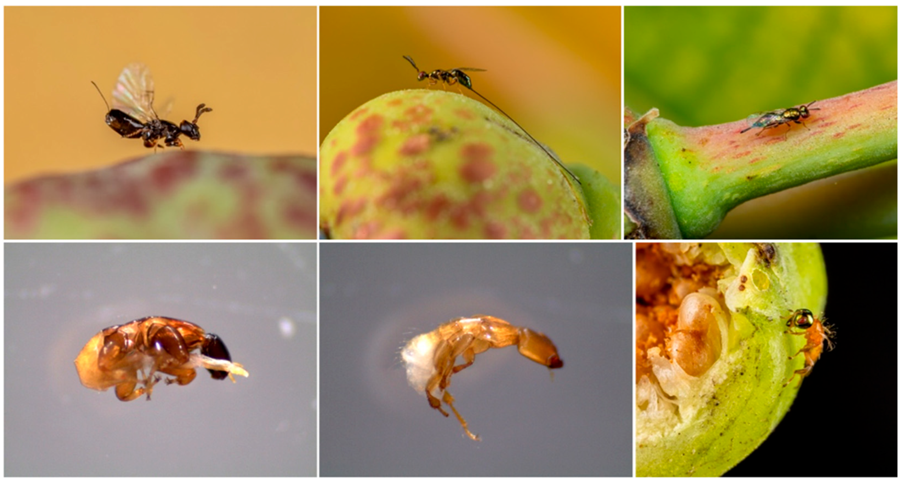 - Van Noort, S.; Wang, R.; Compton, S.G. Fig Wasps (Hymenoptera: Chalcidoidea: Agaonidae, Pteromalidae) Associated with Asian Fig Trees (Ficus, Moraceae) in Southern Africa: Asian Followers and African Colonists. Afr. Invertebr. 2013, 54, 381–400. [Google Scholar] [CrossRef]