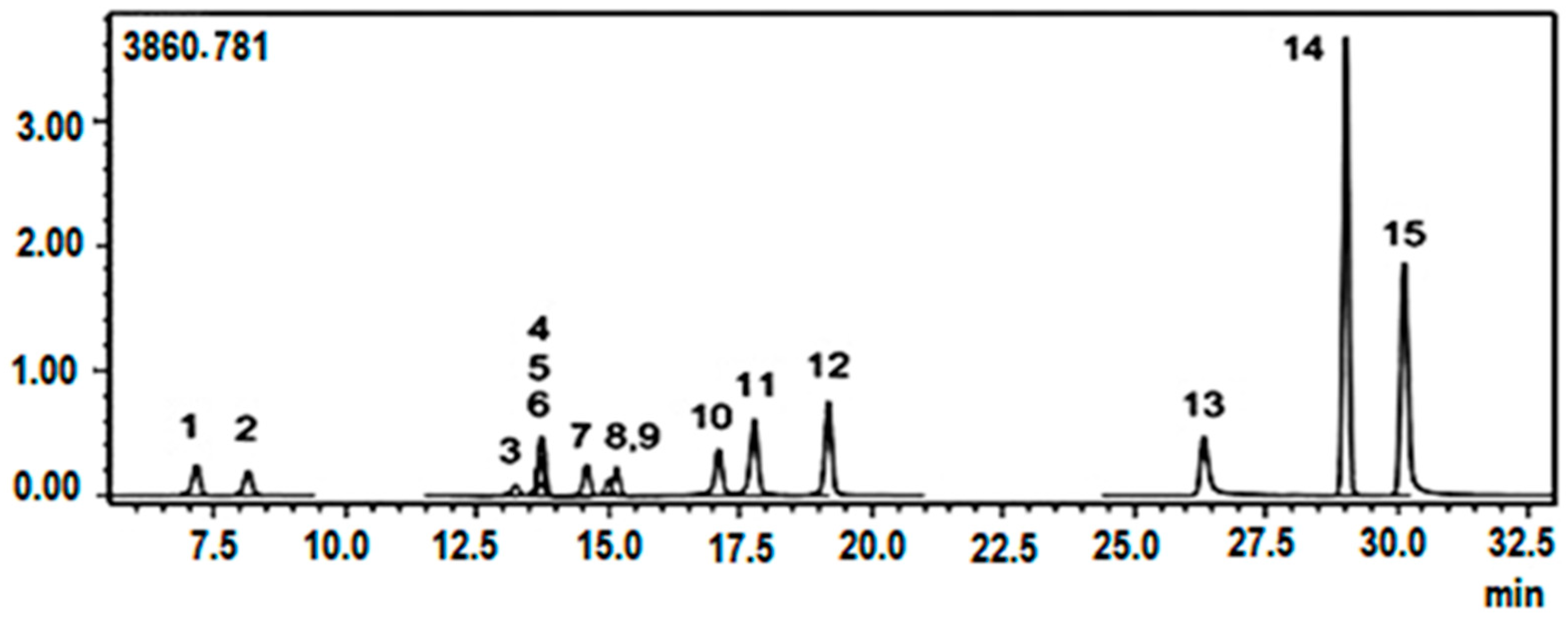 - Akdeniz, M.; Yilmaz, M.A.; Ertas, A.; Yener, I.; Firat, M.; Aydin, F.; Kolak, U. Method validation of 15 phytochemicals in Hypericum lysimachioides var. spathulatum by LC–MS/MS, and fatty acid, essential oil, and aroma profiles with biological activities. J. Food Meas. Charact. 2020, 14, 3194–3205. [Google Scholar] [CrossRef]