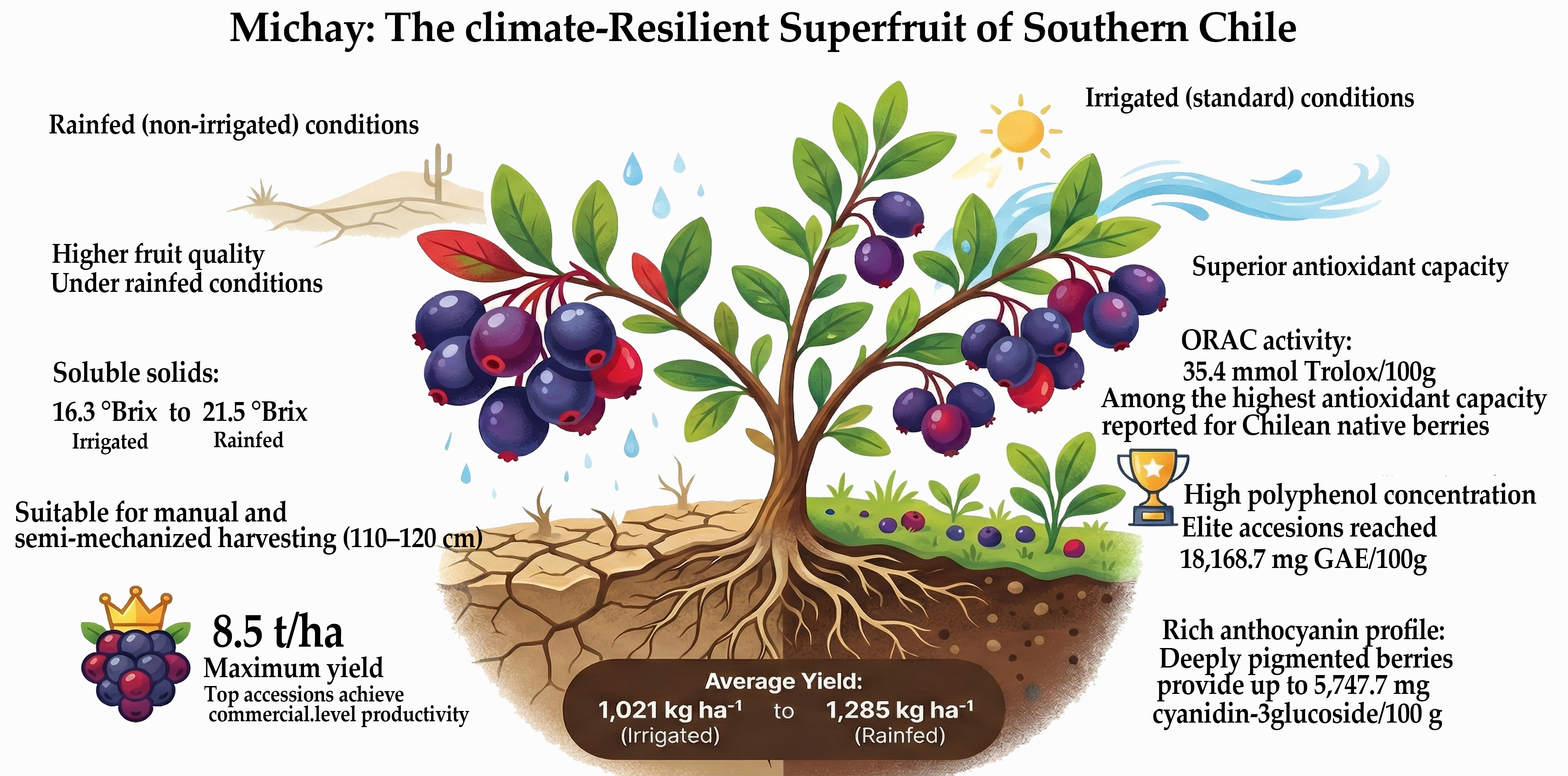 2.3.3. Concentration of Total Polyphenols, Anthocyanins, and ORAC Activity in Michay Fruit Under Rainfed Conditions
